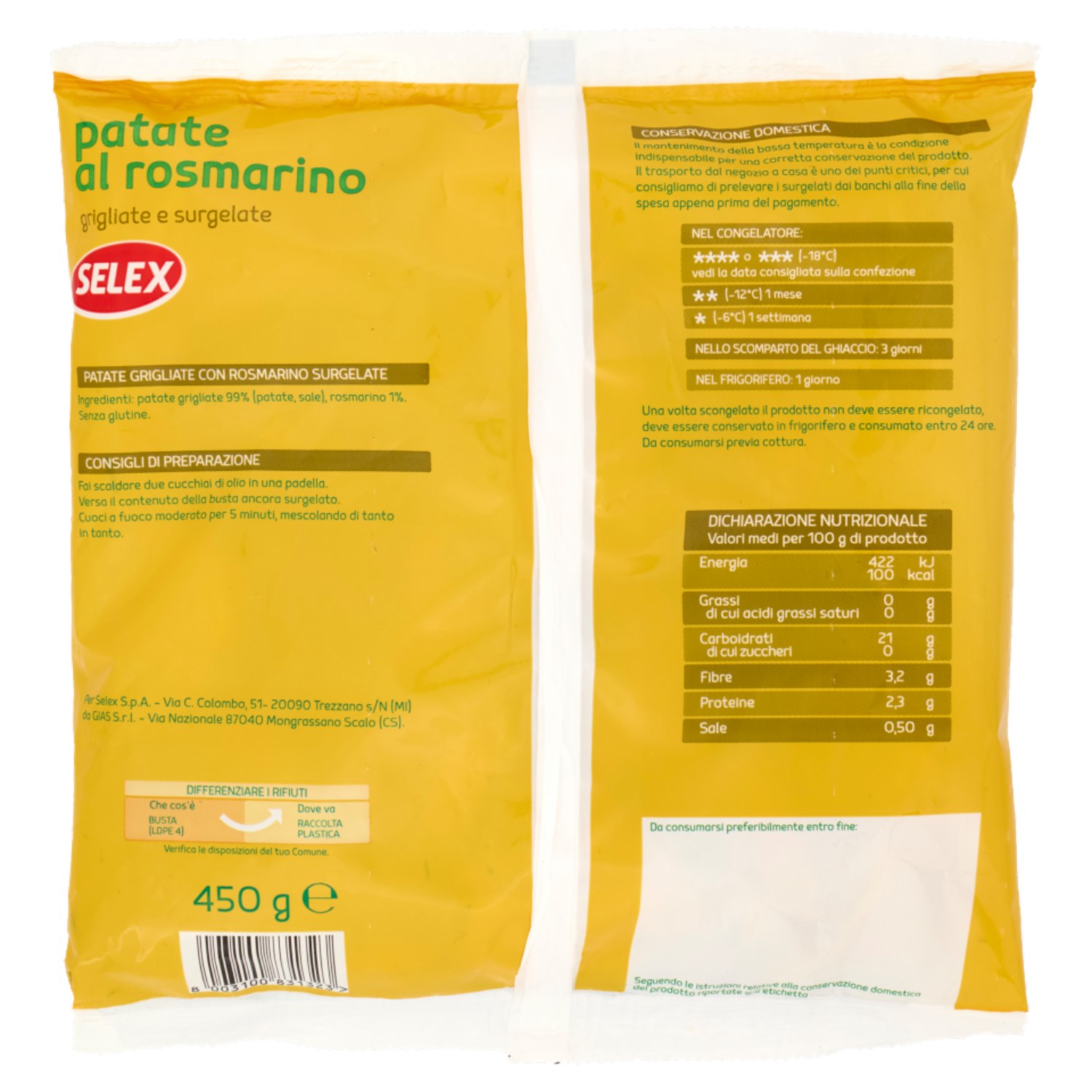 Il mantenimento della bassa temperatura è la condizione indispensabile per una corretta conservazione del prodotto. Il trasporto dal negozio a casa è uno dei punti critici, per cui consigliamo di prelevare i surgelati dai banchi alla fine della spesa appena prima del pagamento. Conservazione domestica Nel congelatore **** o *** (-18°C) vedi la data consigliata sulla confezione ** (-12°C) 1 mese * (-6°C) 1 settimana Nello scomparto del ghiaccio 3 giorni Nel frigorifero 1 giorno Una volta scongelato il prodotto non deve essere ricongelato, deve essere conservato in frigorifero e consumato in giornata. Da consumarsi previa cottura.