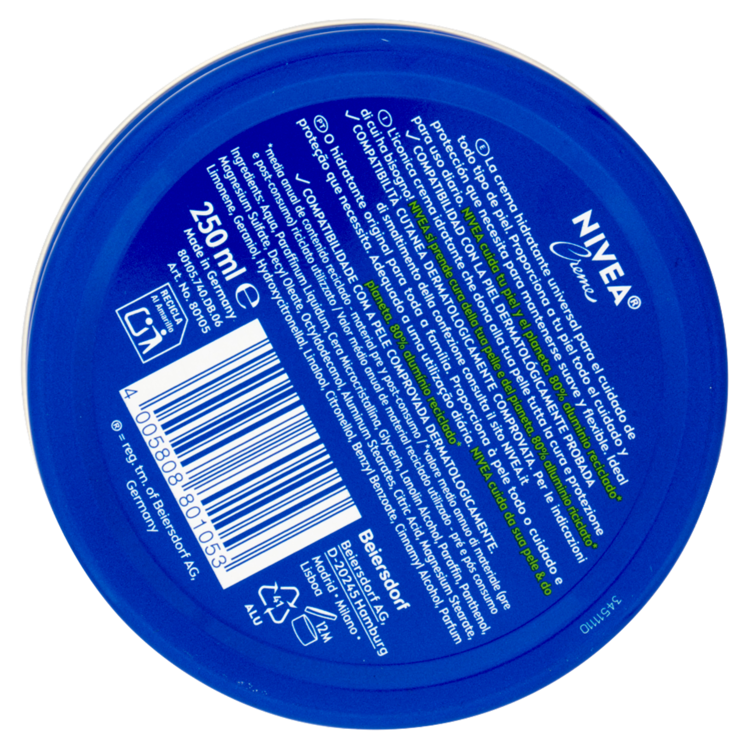 L'iconica crema idratante che dona alla tua pelle tutta la cura e protezione di cui ha bisogno! Nivea si prende cura della tua pelle e del pianeta. 80% alluminio riciclato* *valore medio annuo di materiale (pre e post-consumo) riciclato utilizzato - Compatibilità Cutanea Dermatologicamente Comprovata.