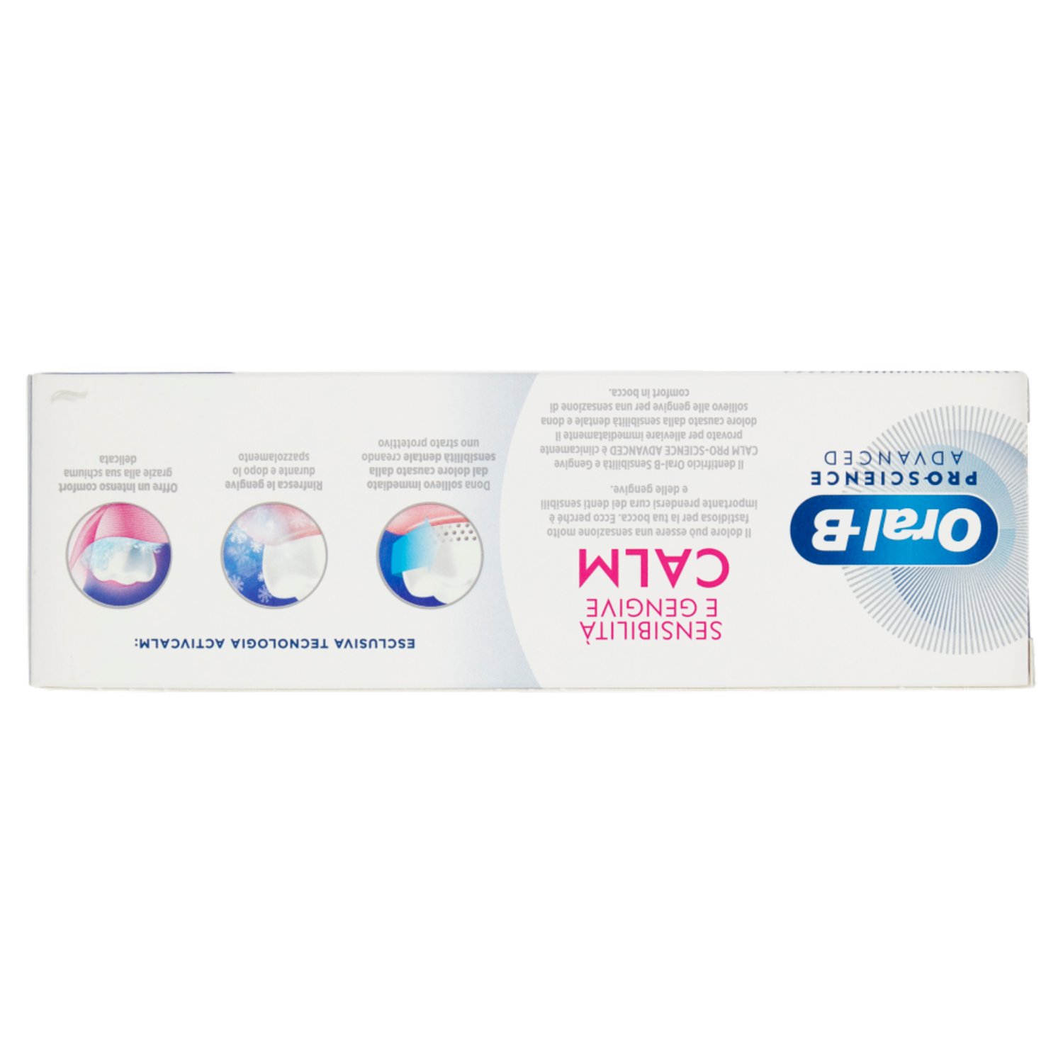 Il dolore può essere una sensazione molto fastidiosa per la tua bocca. Ecco perché è importante prendersi cura dei denti sensibili e delle gengive. Il dentifricio Oral-B Sensibilità e Gengive Calm Pro-Science Advanced è clinicamente provato per alleviare immediatamente il dolore causato dalla sensibilità dentale e dona sollievo alle gengive per una sensazione di comfort in bocca. Esclusiva Tecnologia Activcalm: Dona sollievo immediato dal dolore causato dalla sensibilità dentale creando uno strato protettivo Rinfresca le gengive durante e dopo lo spazzolamento Offre un intenso comfort grazie alla sua schiuma delicata