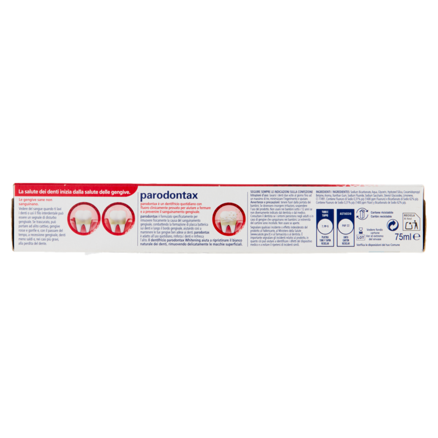 La salute dei denti inizia dalla salute delle gengive. Le gengive sane non sanguinano. Vedere del sangue quando ti lavi i denti o usi il filo interdentale può essere un segnale di disturbo gengivale. Se trascurato, può portare ad alito cattivo, gengive rosse e gonfie e, con il passare del tempo, a recessione gengivale, denti meno saldi e, nei casi più gravi, alla perdita del dente. parodontax è un dentifricio quotidiano con fluoro clinicamente provato per aiutare a fermare e a prevenire il sanguinamento gengivale. parodontax è formulato specificatamente per rimuovere fisicamente la causa del sanguinamento gengivale, combattendo la formazione di placca batterica sui denti e lungo il bordo gengivale, aiutando così a mantenere le tue gengive ben adese ai denti. parodontax è adatto all'uso quotidiano, rinforza i denti e rinfresca l'alito. Il dentifricio parodontax Whitening aiuta a ripristinare il bianco naturale dei denti, rimuovendo delicatamente le macchie superficiali.