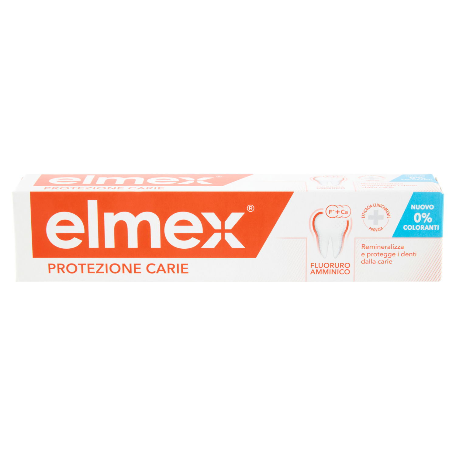 Remineralizza le parti danneggiate dello smalto - così i denti sono protetti efficacemente dalla carie. Come si forma la carie? Lo zucchero presente nel nostro cibo può causare la carie in quanto porta ad una perdita di minerali nei nostri denti. La carie non si forma improvvisamente, ma dopo un lungo periodo. Se nelle sue fasi iniziali, questo processo può essere arrestato e invertito - in questo modo si può prevenire la carie. Come può aiutare il dentifricio elmex Protezione Carie? La formula altamente efficace di elmex con fluoruro amminico è stata specificamente studiata per proteggere dalla carie. Formando rapidamente uno strato protettivo, remineralizza i denti ed aiuta a prevenire la perdita di minerali. Di conseguenza, rafforza lo smalto e rende i denti più resistenti alla carie. Fluoruro amminico - lo speciale principio attivo per una protezione efficace dalla carie. Ideale per chi porta un apparecchio ortodontico