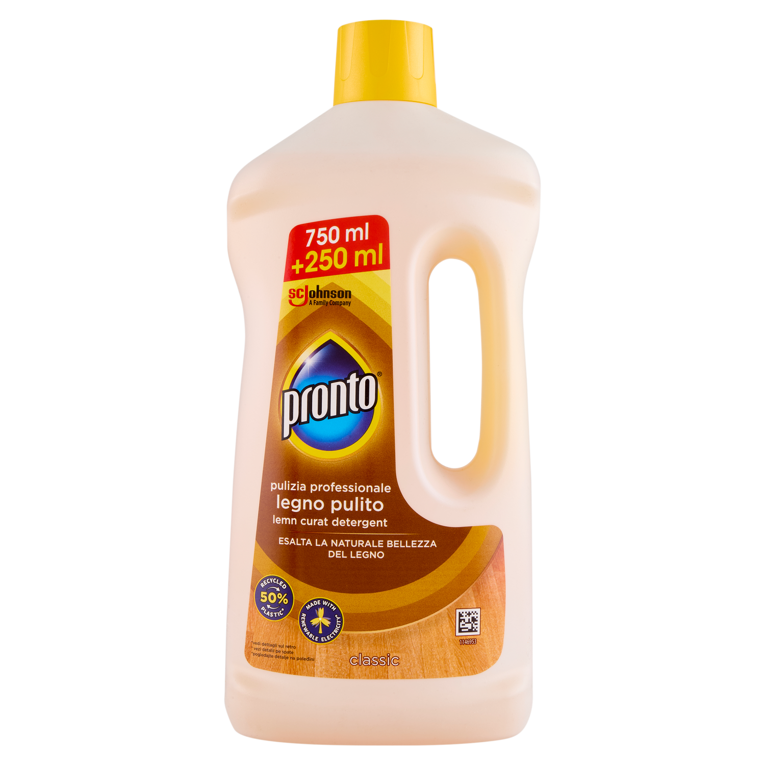 Flacone composto al 50% da plastica post-consumo riciclata, ad esclusione del tappo. Prodotto riempito e confezionato in uno stabilimento che opera al 100% con energia elettrica rinnovabile. Pronto Legno Pulito Classic è una formula delicata che rimuove facilmente lo sporco dai pavimenti senza lasciare aloni e residui. Funziona su: pavimenti in legno sigillato, in laminato e che non richiedono l'uso di cera. Non Raccomandato su: mobili, pavimenti non sigillati, trattati con cera e in legno invecchiato.