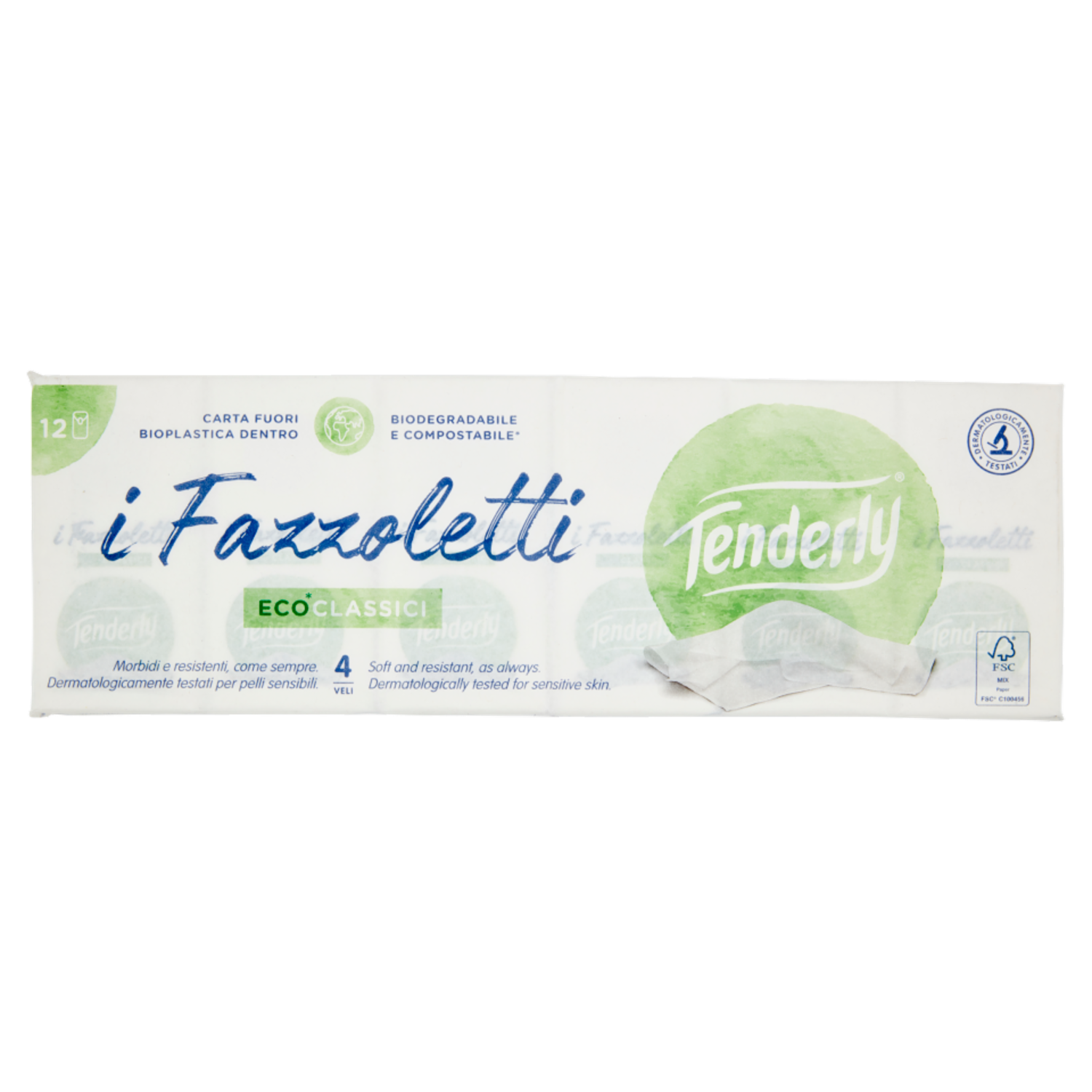 In soffice cellulosa, naturalmente morbidi e resistenti Tenderly è presente nella quotidianità di milioni di famiglie, con la tenerezza che da sempre la contraddistingue. I fazzoletti Ecoclassici sono soffici e delicati sulla pelle, pratici e resistenti, da utilizzare quotidianamente per assicurarsi igiene e pulizia in ogni occasione. In pura cellulosa, dermatologicamente testati, sono perfetti per ogni tipo di pelle, anche le più sensibili. La morbidezza di sempre, da oggi nella nuova confezione 100% compostabile e biodegradabile, con stecca in carta e pacchettini in bioplastica, per aiutarti a rispettare e proteggere la natura. Carta fuori bioplastica dentro Biodegradabile e compostabile* *Imballo in carta riciclabile; pacchettino in bioplatica biodegradabile e compostabile
