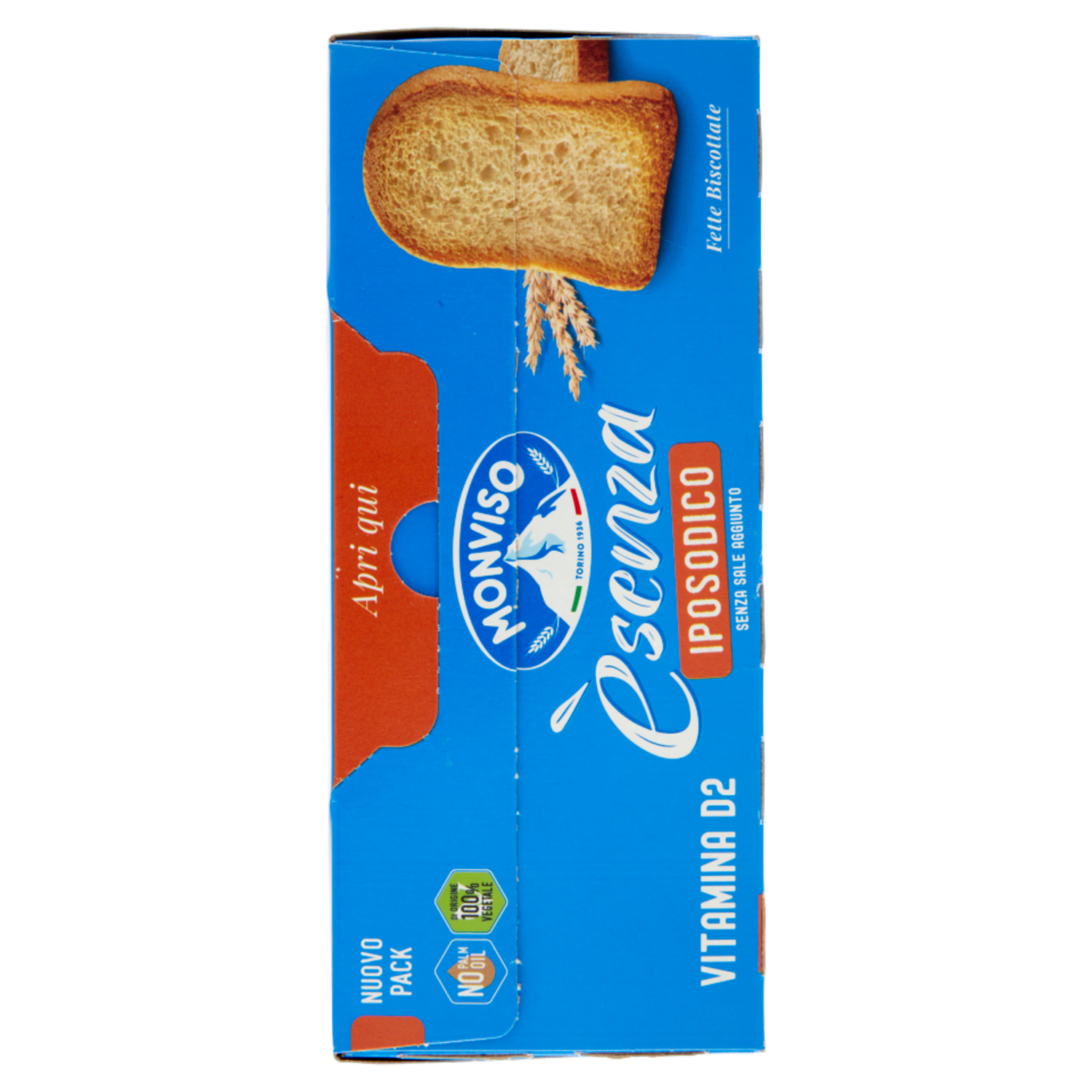 Monviso èSenza, ma con gusto Riduzione consumo di sodio + Vitamina D2 = La tua scelta di benessere Ipodosico con vitamina D2 - Nella ricetta il sale non è aggiunto, ma è naturalmente presente negli ingredienti che la compongono. La riduzione del consumo di sodio contribuisce al mantenimento di una normale pressione sanguigna mentre la vitamina D2 contribuisce al mantenimento della normale funzione muscolare e del sistema immunitario. Monviso ama la natura Confezione con -49% di plastica* *rispetto al precedente confezionamento in flow pack Confezione esterna in carta certificata FSC Il materiale di origine forestale in questo prodotto è riciclato. L'etichetta FSC garantisce un uso responsabile delle risorse forestali del mondo.