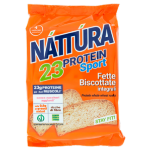 Le Fette Biscottate Protein Náttúra sono ricche di proteine e sono ideali per l'alimentazione di atleti e sportivi: le proteine contribuiscono alla crescita della massa muscolare⁽ ⁾. Sono senza zuccheri aggiunti, senza olio dì palma e hanno solo 0,8g di grassi saturi. Completa questa ricetta la farina di grano integrale che rende le Fette Biscottate Protein ricche di fibre. Ideali per una colazione o merenda energetica, prima o dopo la palestra. 23g Proteine per i tuoi Muscoli⁽ ⁾