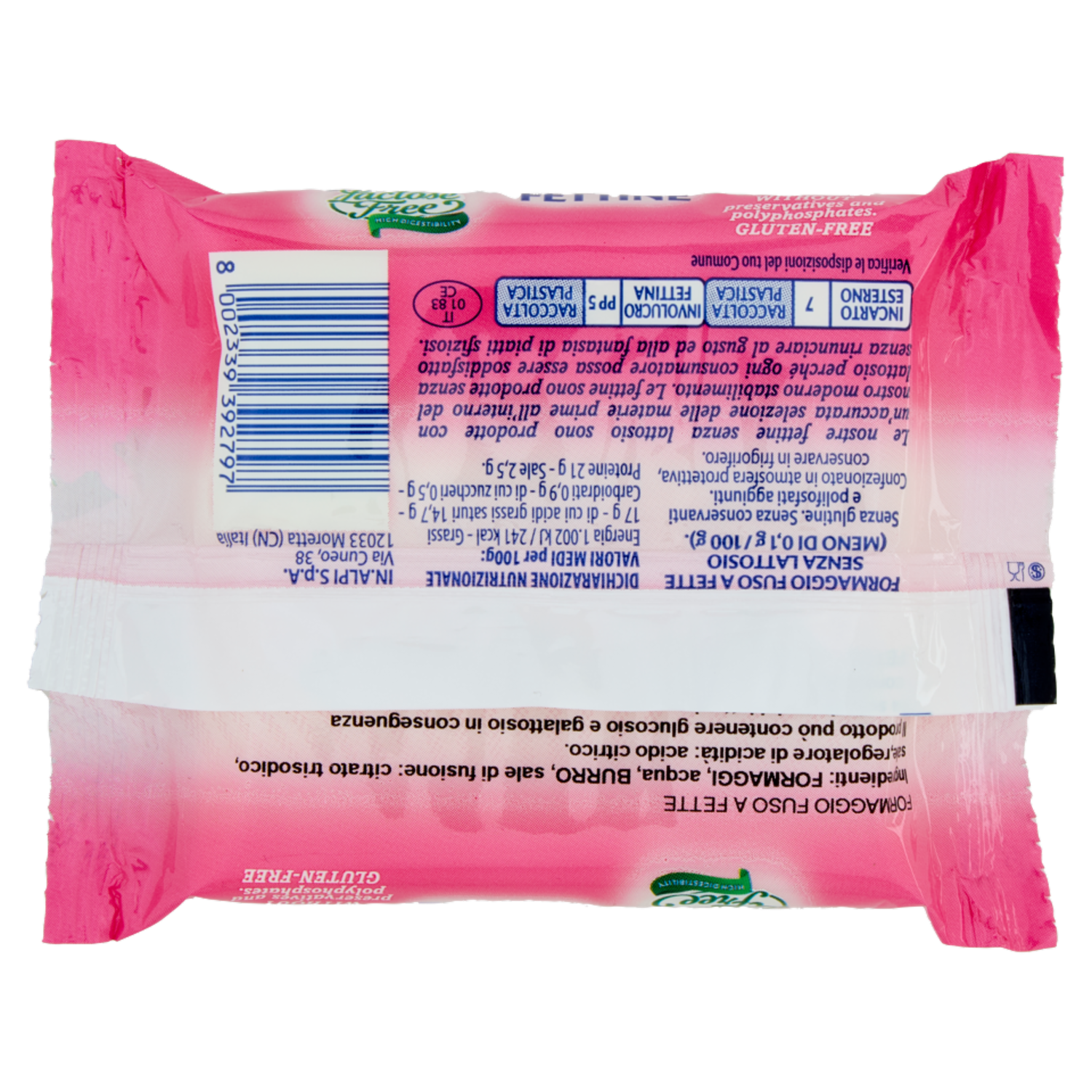 Formaggio fuso a fette senza lattosio (meno di 0,1 g / 100 g) Senza glutine. Senza conservanti e polifosfati aggiunti. Le nostre fettine senza lattosio sono prodotte con un'accurata selezione delle materie prime all'interno del nostro moderno stabilimento. Le fettine sono prodotte senza lattosio perché ogni consumatore possa essere soddisfatto senza rinunciare al gusto ed alla fantasia di piatti sfiziosi.