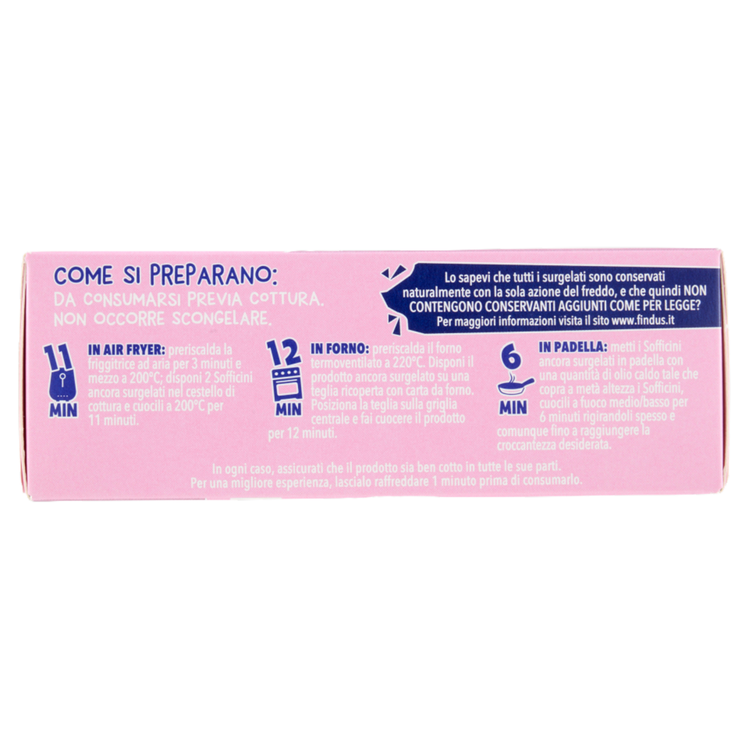 Come si preparano: Da consumarsi previa cottura. 11 Min - In air fryer: preriscalda la friggitrice ad aria per 3 minuti e mezzo a 200°C; riponi 2 Sofficini ancora surgelati nel cestello di cottura e cuocili a 200°C per 11 minuti. Prima di consumarli assicurati che siano ben caldi anche all'interno. 12 Min - In forno: disponi i Sofficini ancora surgelati su una teglia antiaderente o ricoperta con carta da forno. Disponi la teglia nel ripiano centrale del forno e cuoci i Sofficini nel forno ventilato preriscaldato a 220°C per 12 minuti. 6 Min - In padella: metti i Sofficini ancora surgelati in padella con una quantità di olio caldo tale che copra a metà altezza i Sofficini, cuocili a fuoco medio/basso per 6 minuti rigirandoli spesso e comunque fino a raggiungere la croccantezza desiderata. In tutti i casi, per esaltare la bontà del prodotto, aspetta 1 minuto prima di consumarlo!
