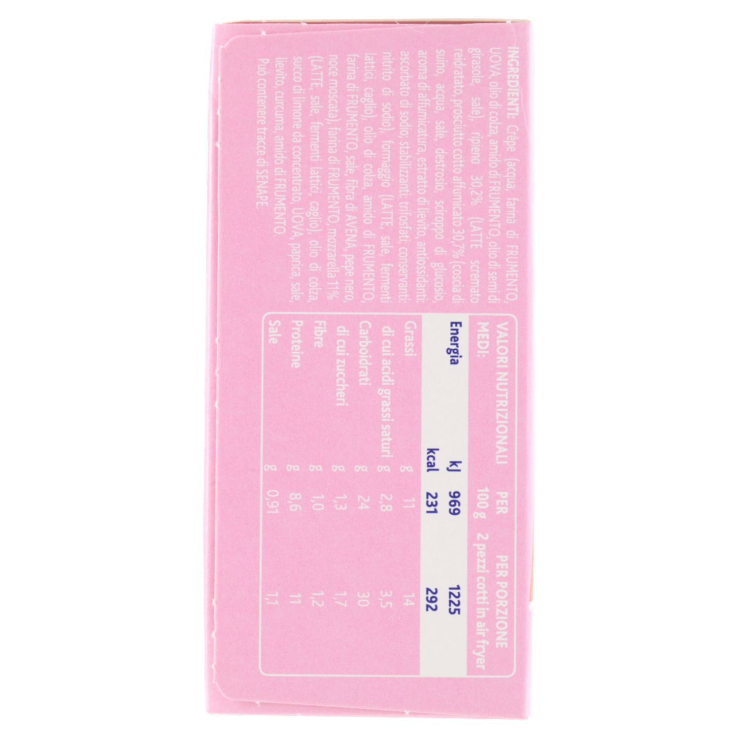 Ripieno 30,2% (latte scremato reidratato, prosciutto cotto affumicato 30,7% (coscia di suino, acqua, sale, destrosio, sciroppo di glucosio, aroma di affumicatura, estratto di lievito, antiossidanti: ascorbato di sodio; stabilizzanti: trifosfati; conservanti: nitrito di sodio), formaggio (latte, sale, fermenti lattici, caglio), olio di colza, amido di frumento, farina di frumento, sale, fibra di avena, pepe nero, noce moscata)