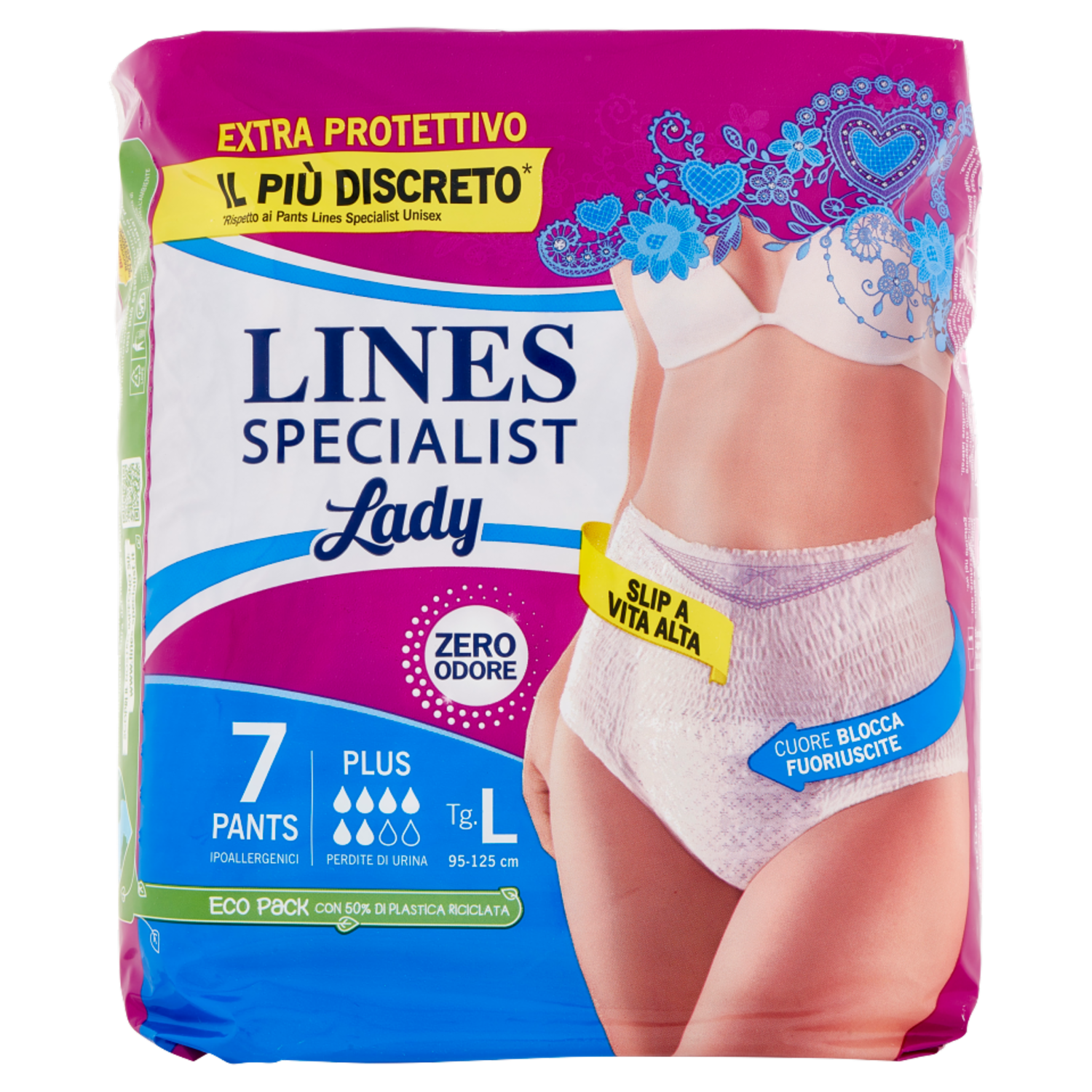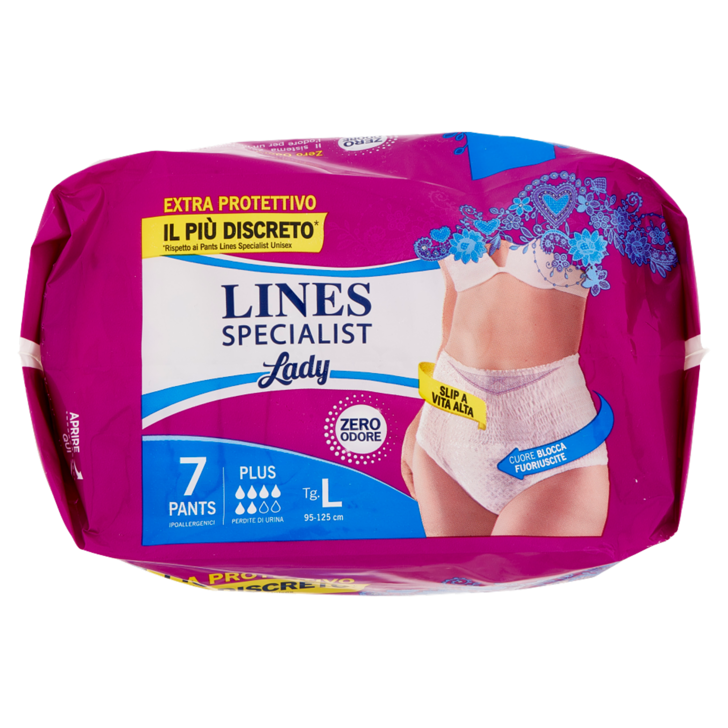 Scegli la taglia più adatta a te Media Circonferenza vita 70 - 100 cm Large Circonferenza vita 95 - 125 cm Zero Odore Il sistema Zero Odore copre e blocca l'odore per un'incredibile discrezione. Il più discreto*. Extra protettivo L'esclusiva struttura a strati e il cuore super assorbente sono studiati per offrirti una protezione completa in pochi millimetri di spessore così potrai avere una discrezione incredibile unita a tutta l'assorbenza Lines. Protezione dalle fuoriuscite Le morbide barriere laterali e il cuore Blocca-Fuoriuscite consentono al liquido di confluire velocemente al centro del prodotto, dove rimane bloccato, così da sentirti sicura e protetta in ogni momento della giornata. Femminile e discreto come il tuo slip Il prodotto si indossa come normale biancheria intima e aderisce perfettamente al tuo corpo. Grazie ad un design femminile e discreto, solo tu sai di indossarlo! Ipoallergenico e dermatologicamente testato Rispetta l'equilibrio naturale della pelle. *Rispetto ai Pants Lines Specialist Unisex Confezione riciclabile con 50% di plastica riciclata.