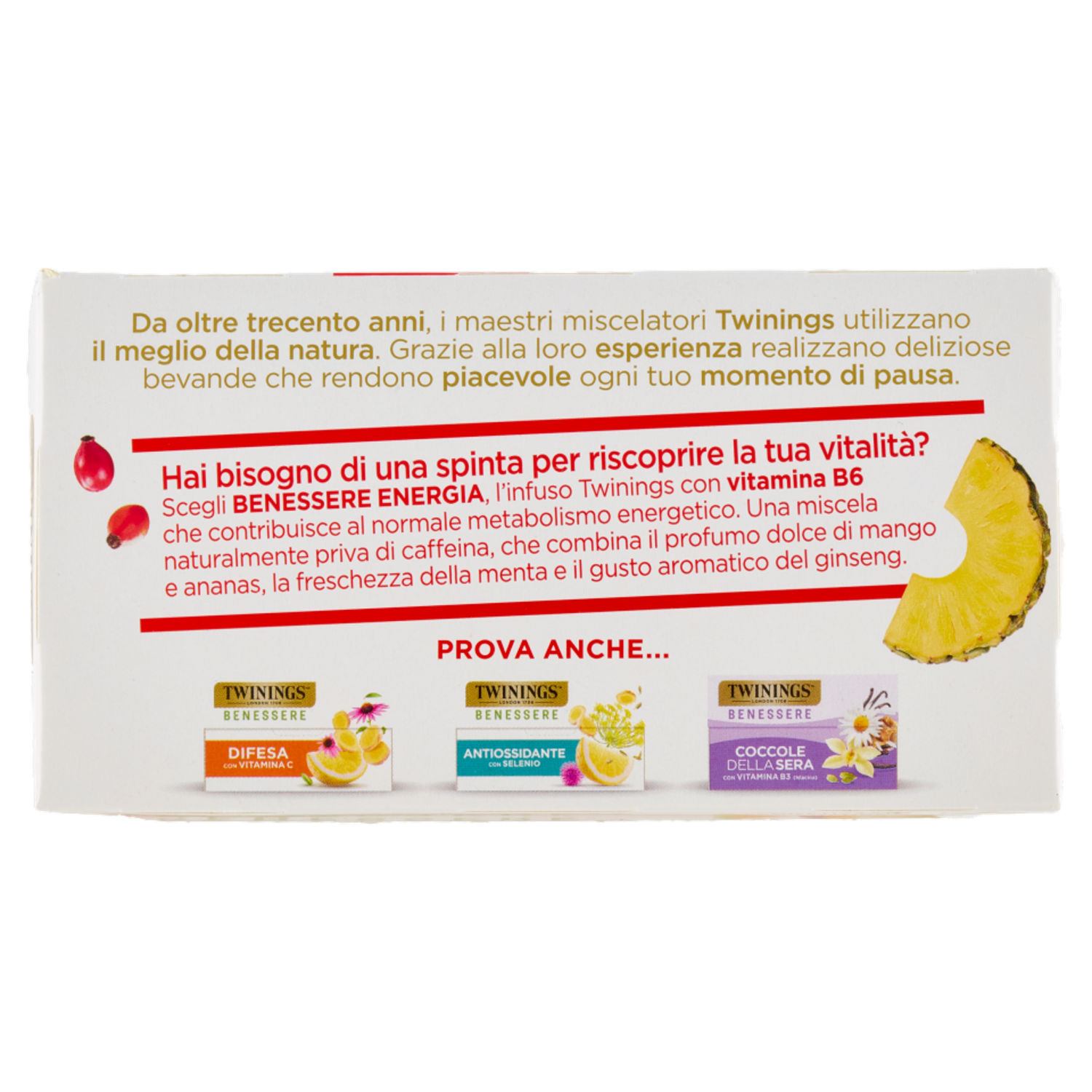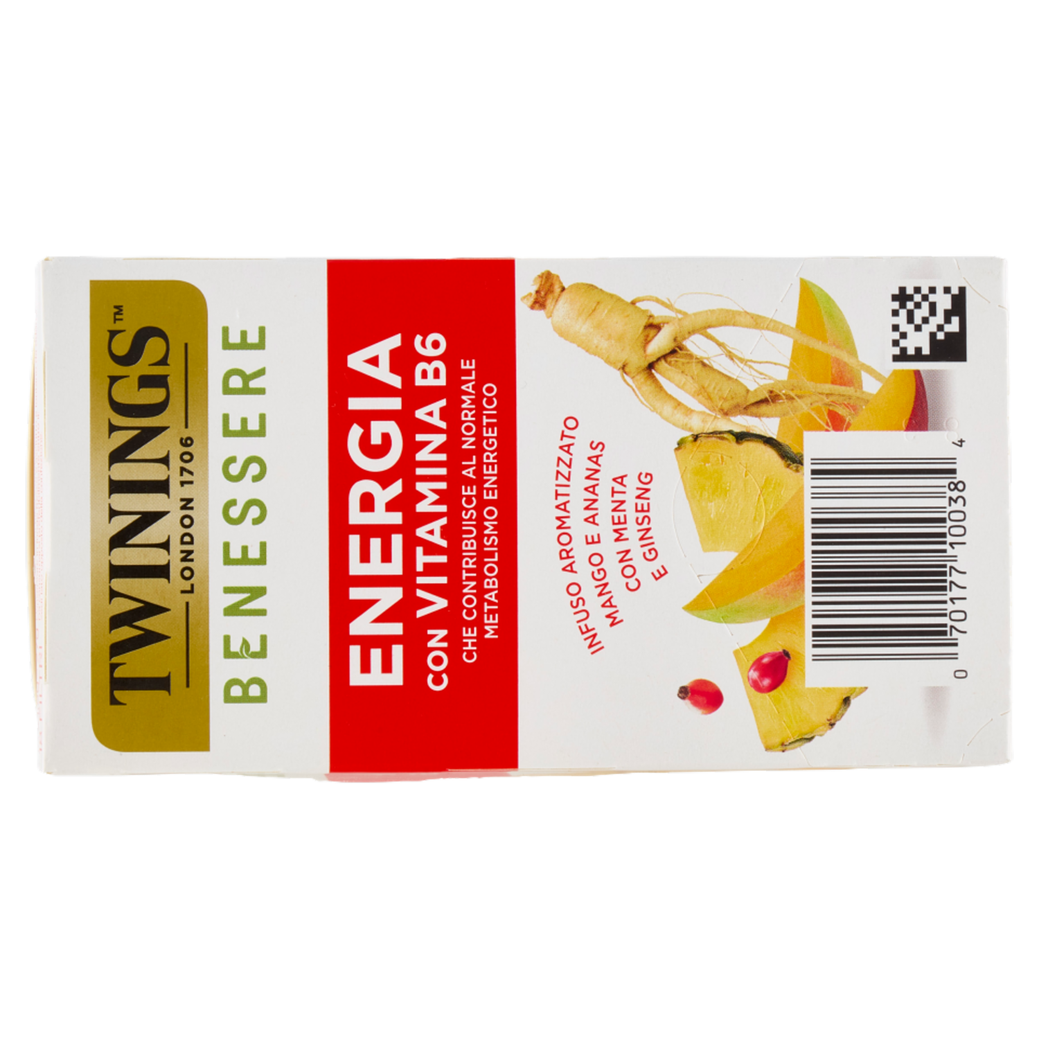 Hai bisogno di una spinta per riscoprire la tua vitalità? Scegli Benessere Energia, l'infuso Twinings con vitamina B6 che contribuisce al normale metabolismo energetico e favorisce il tuo benessere. Una miscela naturalmente priva di caffeina, che combina il profumo dolce di mango e ananas, la freschezza della menta e il gusto aromatico del ginseng. La vitamina B6 contribuisce al normale metabolismo energetico. Prendi una buona abitudine per il tuo benessere quotidiano! Nell'ambito di una dieta varia ed equilibrata e di uno stile di vita sano, di cui ti ricordiamo l'importanza, ti consigliamo di bere almeno una tazza al giorno.