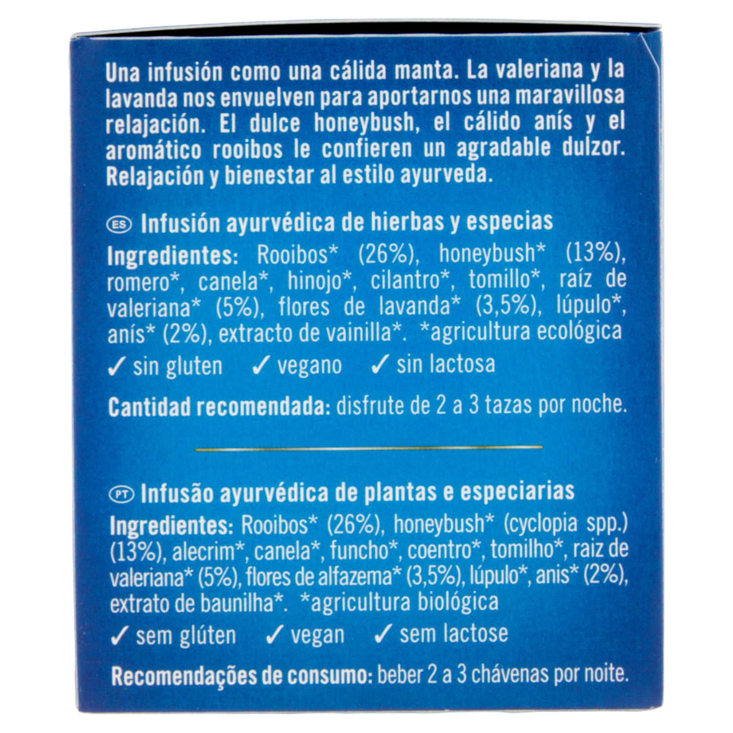 Un infuso piacevole come una calda coperta. Valeriana e lavanda ci stringono in un caldo abbraccio per un totale relax. Il dolce honeybush, il caloroso anice e lo speziato rooibos conferiscono una piacevole dolcezza. Per riposare e rigenerarsi alla maniera ayurvedica. - senza glutine - vegano - senza lattosio