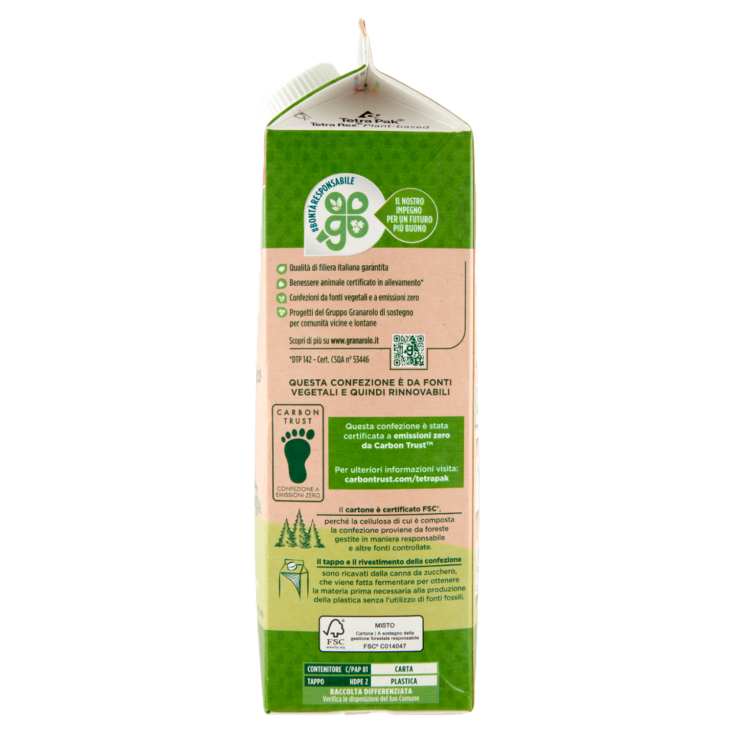 Il latte Biologico Granarolo nasce da una filiera italiana ed è controllato fin dagli allevamenti. Garantito dalla certificazione per il Benessere Animale in allevamento CSQA* *DTP 142 - Cert. CSQA n° 53446 Alimentazione delle mucche di origine biologica e No OGM come previsto dalla legge. Solo latte 100% Italiano dagli allevamenti della nostra filiera Questa confezione è da fonti vegetali e quindi rinnovabili Il cartone è certificato FSC, perchè la cellulosa di cui è composta la confezione proviene da foreste gestite in maniera responsabile e altre fonti controllate. Il tappo e il rivestimento della confezione sono ricavati dalla canna da zucchero, che viene fatta fermentare per ottenere la materia prima necessaria alla produzione della plastica senza l'utilizzo di fonti fossili.