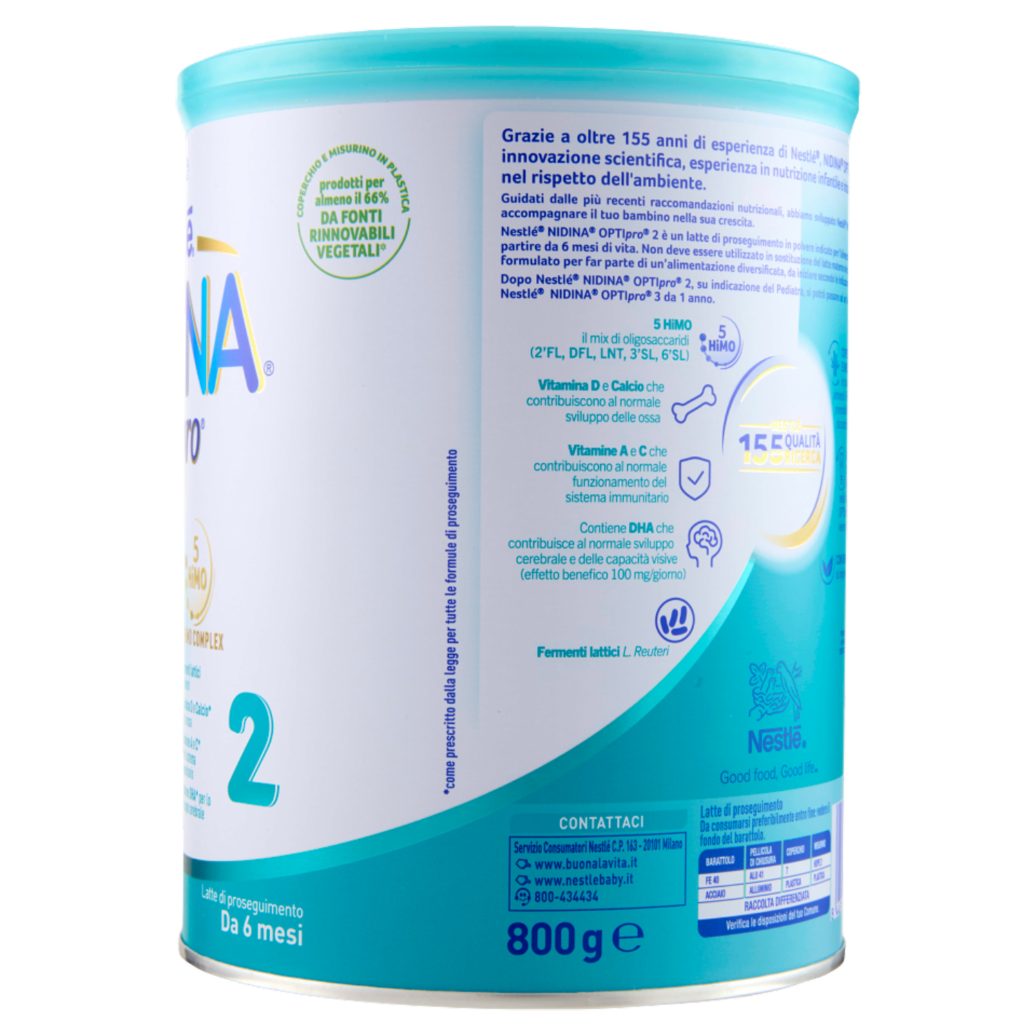Grazie a oltre 155 anni di esperienza di NESTLÉ, NIDINA OPTIPRO combina innovazione scientifica, esperienza in nutrizione infantile e iniziative concrete nel rispetto dell'ambiente. Guidati dalle più recenti raccomandazioni nutrizionali, abbiamo sviluppato NESTLÉ, NIDINA OPTIPRO per accompagnare il tuo bambino nella sua crescita. NESTLÉ, NIDINA OPTIPRO 2 è un latte di proseguimento in polvere indicato per l'alimentazione del lattante a partire da 6 mesi di vita. Non deve essere utilizzato in sostituzione del latte materno nei primi 6 mesi di vita. È formulato per far parte di un'alimentazione diversificata, da iniziare secondo le indicazioni del Pediatra. Dopo NESTLÉ NIDINA OPTIPRO 2, su indicazione del Pediatra, si potrà passare ad un latte di crescita come NESTLÉ NIDINA OPTIPRO 3 da 1 anno. Nestlé 155 - Qualità - Ricerca 5 HiMO il mix di oligosaccaridi (2'FL, DFL, LNT, 3'SL, 6'SL) Vitamina D e Calcio che contribuiscono al normale sviluppo delle ossa Vitamine A e C che contribuiscono al normale funzionamento del sistema immunitario Contiene DHA che contribuisce al normale sviluppo cerebrale e delle capacità visive (effetto benefico 100 mg/giorno) Fermenti lattici L. Reuteri Coperchio e Misurino in plastica, prodotti per almeno il 66% da fonti rinnovabili vegetali (canna da zucchero)°. Energia Elettrica da Fonti Rinnovabili nella fabbrica dove NIDINA OPTIPRO 2 polvere viene prodotto. Con DHA di origine vegetale. °Coperchio e misurino certificati da: TŪV Austria - S1111 - Nuova formula - Coperchio e misurino in plastica - prodotti per almeno il 66% da Fonti Rinnovabili Vegetali° - 5 HiMO - 5 HiMO complex - Fermenti lattici L. Reuteri - Vitamina D e Calcio* per le ossa - Vitamine A e C* per il sistema immunitario - Contiene DHA* per lo sviluppo cerebrale - °Coperchio e misurino certificati da: TŪV Austria - S1111 - *come prescritto dalla legge per tutte le formule di proseguimento