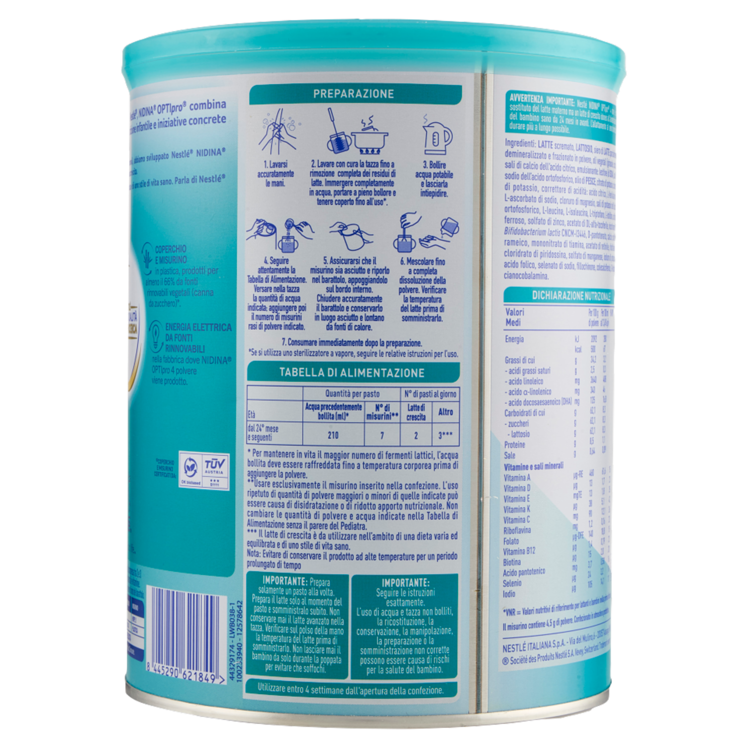 Importante: Seguire le istruzioni esattamente. - L'uso di acqua e biberon non bolliti, la ricostituzione, la conservazione, la manipolazione, la preparazione o la somministrazione non corrette possono essere causa di rischi per la salute del bambino. Preparazione 1 Prima della preparazione lavarsi ed asciugarsi accuratamente le mani. 2 Lavare con la massima cura biberon, tettarella e ghiera. 3 Bollire per 5 minuti biberon, tettarella e ghiera precedentemente lavati e tenerli coperti fino al momento dell'uso. 4 Bollire acqua potabile e lasciarla intiepidire. 5 Versare nel biberon la quantità esatta di acqua indicata nella Tabella di Alimentazione. 6 Dosare la polvere con il misurino contenuto nella confezione. 7 Aggiungere il numero di misurini rasi di polvere indicato nella Tabella di Alimentazione. 8 Dopo l'uso, assicurarsi che il misurino sia asciutto e riporlo nella parte superiore della confezione, appoggiandolo sul bordo interno. 9 Chiudere il biberon, agitare fino a completa dissoluzione della polvere e somministrare subito. 10 Chiudere accuratamente il barattolo e conservarlo in luogo asciutto e lontano da fonti di calore. Consumare il prodotto entro 4 settimane dall'apertura della confezione. Tabella di alimentazione Età: dal 24° mese e seguenti | Quantità per pasto - Acqua bollita (ml)*: 210 - N° di misurini**: 7 | N° di pasti al giorno - Biberon: 2 - Altro: 3*** * Per mantenere in vita il maggior numero di fermenti lattici, l'acqua bollita deve essere raffreddata a temperatura idonea per il bambino prima di aggiungere la polvere. ** Usare esclusivamente il misurino inserito nella confezione. L'uso ripetuto di quantità di polvere maggiori o minori di quelle indicate può essere causa di disidratazione o di ridotto apporto nutrizionale. Non cambiare le quantità di polvere e acqua indicate nella Tabella di Alimentazione senza il parere del Medico. *** Il latte di crescita è da utilizzare nell'ambito di una dieta varia ed equilibrata e di uno stile di vita sano. Nota: Evitare di conservare il prodotto ad alte temperature per un periodo prolungato di tempo. Avvertenza importante: NESTLÉ NIDINA OPTIPRO 4 non è un sostituto del latte materno ma un latte di crescita idoneo all'alimentazione del bambino sano da 24 mesi in avanti. L'allattamento al seno dovrebbe durare più a lungo possibile.