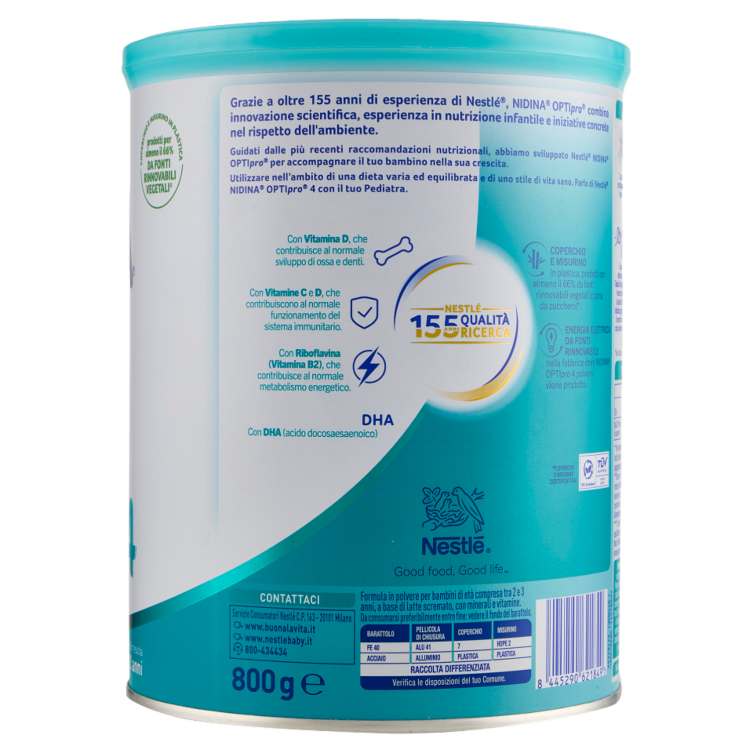 Conosci il ruolo che le proteine hanno per il bambino? Le proteine sono chiamate i "mattoni" della vita e rendono possibile la maggior parte dei processi biologici. Le caratteristiche e le funzioni delle proteine sono influenzate dagli aminoacidi che le compongono. Tra gli aminoacidi, alcuni di essi sono definiti essenziali, perché non possono essere sintetizzati dall'organismo e devono essere necessariamente forniti con l'alimentazione. NESTLÉ NIDINA OPTIPRO 4 è il nostro latte di crescita Premium sviluppato dagli esperti Nestlé, ispirati da 60 anni di ricerca sul latte materno e dalle più recenti raccomandazioni nutrizionali. - Con Vitamina D, che contribuisce al normale sviluppo di ossa e denti. - Con Vitamine C e D, che contribuiscono al normale funzionamento del sistema immunitario. - Con Vitamina B12 e Riboflavina (Vitamina B2), che contribuisce al normale metabolismo energetico. - Con DHA (acido docosaesaenoico). - Senza olio di palma Utilizzare nell'ambito di una dieta varia ed equilibrata e di uno stile di vita sano. Parla di NESTLÉ NIDINA OPTIPRO 4 con il tuo Pediatra. - Coperchio e misurino in plastica - Prodotti per almeno il 66% da Fonti Rinnovabili Vegetali* - Vitamina D - Vitamina C - Vitamine B2 e B12 - Contiene DHA