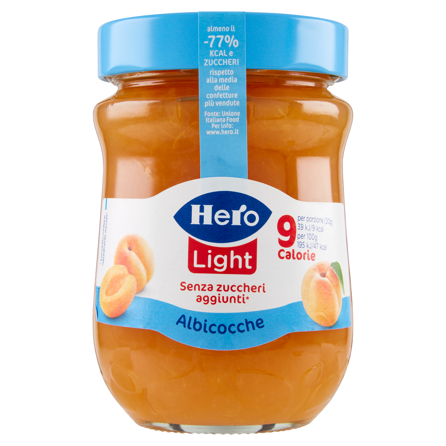 Almeno il -77% Kcal e Zuccheri rispetto alla media delle confetture più vendute - Fonte: Unione Italiana Food. Per info: www.hero.it