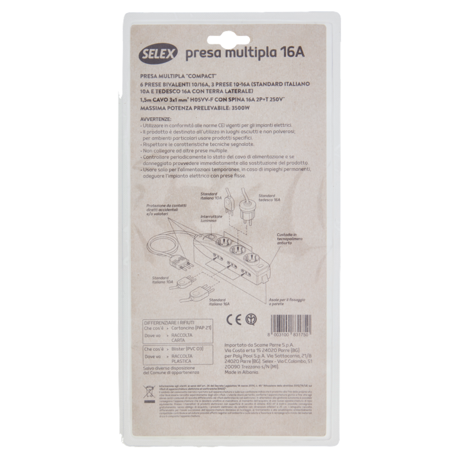 AVVERTENZE: - Utilizzare in conformità alle norme CEI vigenti per gli impianti elettrici. - Il prodotto è destinato all'utilizzo in luoghi asciutti e non polverosi; per ambienti particolari usare prodotti specifici. - Rispettare le caratteristiche tecniche segnalate. - Non collegare ad altre prese multiple. - Controllare periodicamente lo stato del cavo di alimentazione e se danneggiato, provvedere immediatamente alla sostituzione del prodotto. - Usare solo per l'alimentazioni temporanee, in caso di impieghi permanenti, adeguare l'impianto elettrico con prese fisse. Informazione agli utenti: ai sensi dell'art. 26 del Decreto Legislativo 14 marzo 2014, n. 49 "Attuazione della direttiva 2012/19/UE sui rifiuti di apparecchiature elettriche ed elettroniche (RAEE)". Il simbolo del cassonetto barrato riportato sull'apparecchiatura o sulla sua confezione indica che il prodotto alla fine della propria vita utile deve essere raccolto separatamente dagli altri rifiuti. L'utente dovrà pertanto, conferire l'apparecchiatura giunta a fine vita agli idonei centri comunali di raccolta differenziata dei rifiuti elettrotecnici ed elettronici. In alternativa alla gestione autonoma è possibile consegnare l'apparecchiatura che si desidera smaltire al rivenditore, al momento dell'acquisto di una nuova apparecchiatura di tipo equivalente. Presso i rivenditori di prodotti elettronici con superficie di vendita di almeno 400 m² è inoltre possibile consegnare gratuitamente, senza obbligo di acquisto, i prodotti elettronici da smaltire con dimensioni inferiori a 25 cm. L'adeguata raccolta differenziata per l'avvio successivo dell'apparecchiatura dismessa al riciclaggio, al trattamento e allo smaltimento ambientalmente compatibile contribuisce ad evitare possibili effetti negativi sull'ambiente e sulla salute e favorisce il reimpiego e/o riciclo dei materiali di cui è composta l'apparecchiatura.