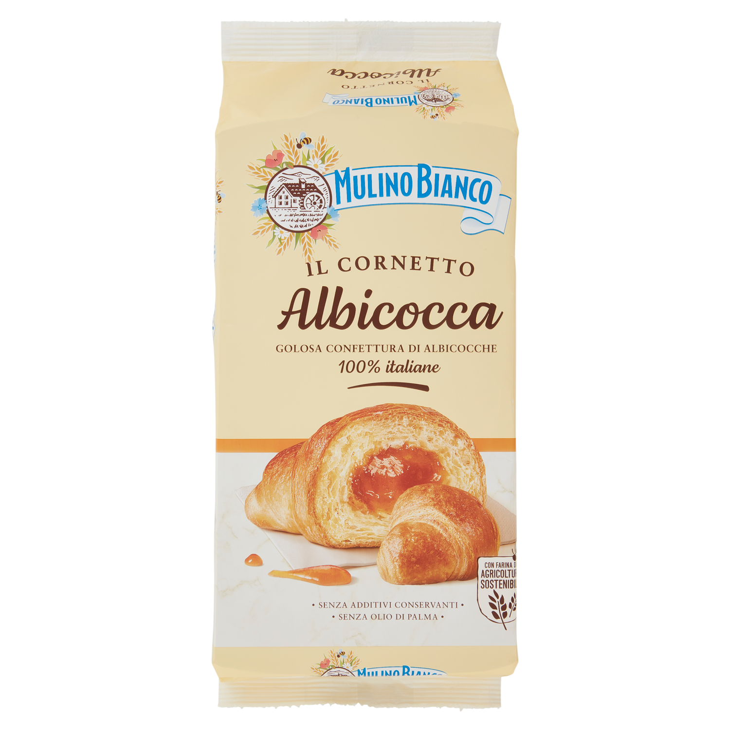 La Carta del Mulino Con farina da agricoltura sostenibile Ogni Cornetto di questa confezione è realizzato con grano tenero da agricoltura sostenibile, seguendo le 10 regole della Carta del Mulino, il disciplinare Mulino Bianco pensato per portare qualità nei prodotti, supportare il lavoro degli agricoltori e proteggere la biodiversità. L'intera filiera è certificata ISCC Plus. Scopri di più: mulinobianco.it/cdm Il buono che non vedi Tutte le nostre merende sono senza additivi conservanti e coloranti, senza grassi idrogenati e senza olio di palma. Si raccomanda di tenerle in un luogo fresco e asciutto. Con lievito di madre - 38 Ore di lenta lievitazione Un ricco impasto lievitato lentamente e lavorato in soffici strati di pasta sfoglia, incontra una golosa farcitura, preparata con albicocche 100% italiane e senza utilizzo di additivi conservanti: così nasce il Cornetto Albicocca Mulino Bianco.