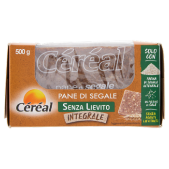 Senza agenti lievitanti Con farina integrale di segale Céréal si impegna per voi il Pane di Segale Senza Lievito Céréal è stato prodotto con la massima cura: - senza lievito e agenti lievitanti - ricco in fibre - a basso contenuto di grassi - senza conservanti ...con 10 pratiche confezioni salva freschezza da 2 fette ciascuna Senza lievito e agenti lievitanti Esistono diversi tipi di sostanze usate per la lievitazione: lievito di birra, lievito naturale (o a pasta acida), polveri lievitanti. Il Lievito di Birra e il Lievito Naturale sono sostanze composte da microrganismi in grado di provocare, con gli enzimi da essi prodotti, una fermentazione. Il Lievito Chimico è composto da carbonato acido di sodio ed altri componenti. Il Pane di Segale Céréal è stato appositamente studiato per chi presenta un'intolleranza al lievito, sia naturale che chimico. La sua ricetta non contiene infatti né lievito né agenti lievitanti. È inoltre particolarmente indicato per chi segue una dieta povera di grassi. Tutto il buono della farina integrale di segale La farina integrale di segale, a differenza di quella cosiddetta raffinata, conserva intatti tutti i componenti del germe e della crusca. Le fibre contenute contribuiscono al tuo benessere. Si consiglia di utilizzare il prodotto nell'ambito di una dieta varia ed equilibrata ed uno stile di vita sano.