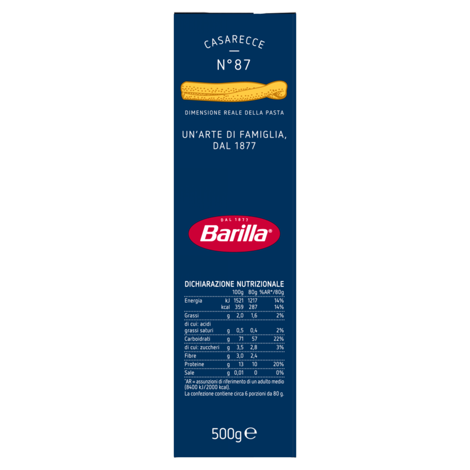 Barilla Dal 1877 Grani selezionati 100% italiani Siamo fieri di essere al fianco delle organizzazioni di 8.000 agricoltori d'Italia che coltivano grano duro di qualità per la nostra pasta. A Parma dal 1877 A Parma il buon cibo è tradizione ed eccellenza gastronomica, gioia di vivere e cultura: qui è dove siamo nati. Il domani è oggi La pasta Barilla la conosci da sempre: perciò abbiamo tolto la finestra trasparente, risparmiando 126.000 kg di plastica all'anno.* Un gesto d'amore Ogni giorno ci impegniamo a darti la nostra pasta migliore, sempre al dente, per far felice chi ami. *rimozione finestra dai Classici Barilla; valore calcolato sulle confezioni in cartoncino vendute nel 2020. Scopri di più su barilla.com/box. Per noi la qualità è una tradizione di famiglia dal 1877. www.barilla.it