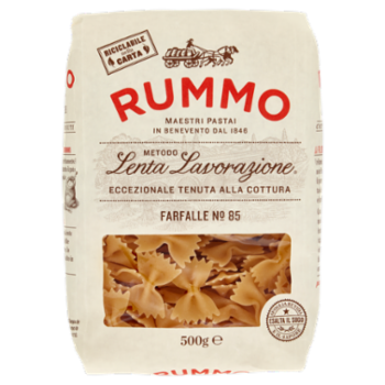 La filosofia del gusto Crediamo che la Pasta sia Cultura del nostro Paese. Per questo rispettiamo il piacere tutto italiano per la buona tavola, le grandi tradizioni regionali e le piccole eccellenze del territorio. Con la Lenta Lavorazione, un esclusivo metodo dal quale nasce una pasta ineguagliabile, vogliamo raccontare un viaggio alla riscoperta dei tempi dell'artigiano, fatti di attenzione e cura dei particolari. La sfoglia ruvida di Rummo Questa Pasta trattiene perfettamente il condimento, esaltandone tutto il gusto ed il profumo grazie alla tipica 'sfoglia' paesana ruvida. Il tuo sugo merita una grande pasta. Un piacere ineguagliabile. Grazie all'esclusivo Metodo a Lenta Lavorazione ed alla qualità delle semole di grano duro utilizzate, la Pasta Rummo è l'ideale per il salto in padella, sempre al dente. Qualità leggendaria certificata - 1846 Scelta nel mondo dai migliori chef