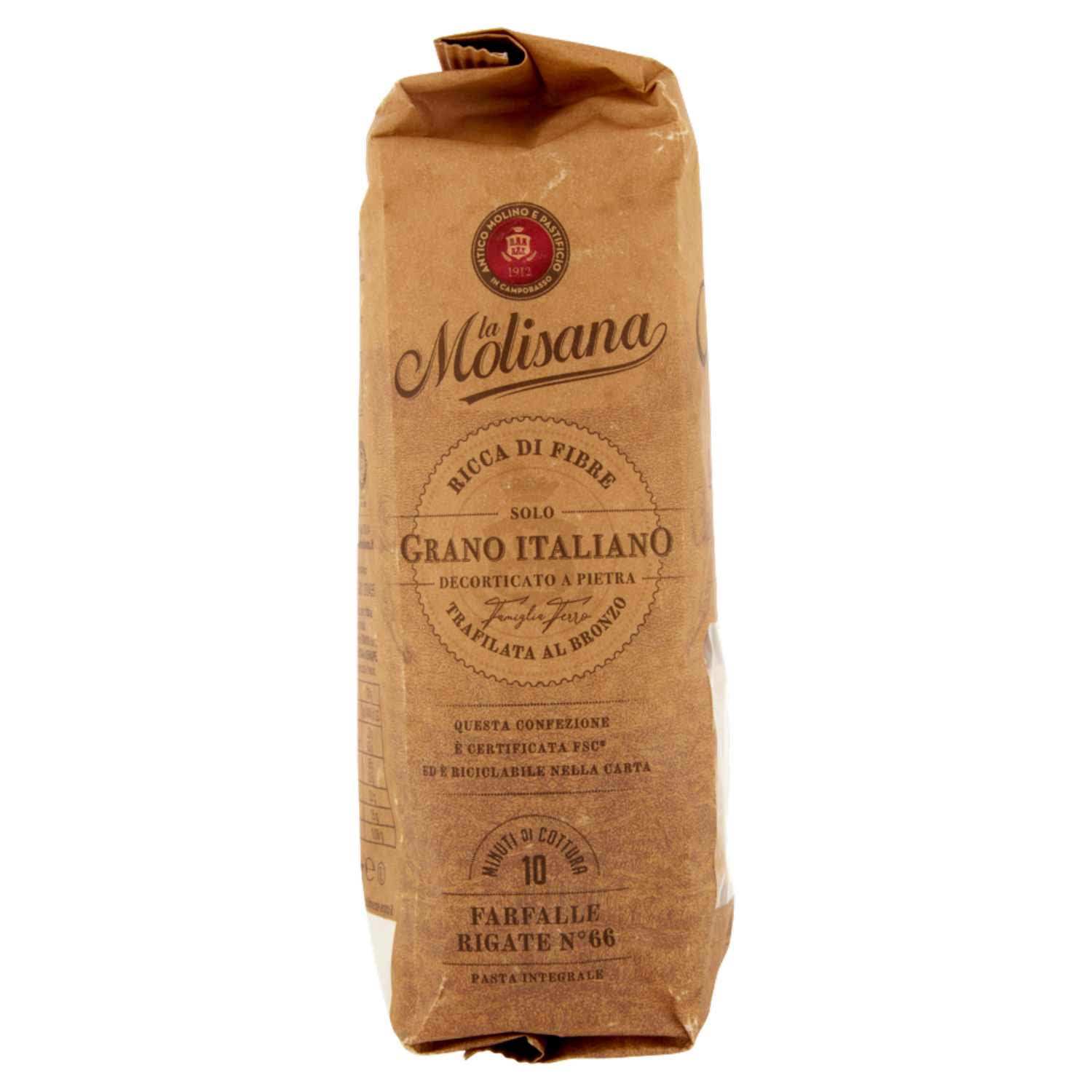 La Molisana Antico Molino e Pastificio in Campobasso 1912 Famiglia Ferro Azienda 100% italiana da filiera integrata Fondata nel 1912 da una famiglia di imprenditori italiani, interamente di proprietà italiana. Il grano Utilizziamo solo grano coltivato in Molise, Abruzzo, Puglia, Lazio e Marche, regioni da sempre vocate alla produzione di grano duro di alta qualità. Il molino Maciniamo da cinque generazioni il miglior grano, lo decortichiamo a pietra per produrre semole più sicure dal punto di vista igienico-sanitario. Il pastificio Trafiliamo al bronzo per ottenere una pasta ruvida e tenace con un'eccellente tenuta in cottura. L'acqua Impastiamo le nostre semole con acqua pura, iposodica con caratteristiche oligominerali delle sorgenti del Matese. LifeGate impatto zero CO₂ La Molisana partecipa al progetto Impatto Zero di LifeGate grazie al quale sono state calcolate, ridotte e compensate le emissioni di CO2 prodotte da questa confezione tramite l'acquisto di crediti di carbonio generati dalla creazione e tutela di foreste in crescita in Madagascar, Brasile e Italia. Ricca di fibre Acqua cristallina di sorgente Mugnai da cinque generazioni