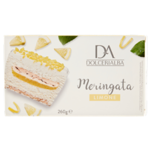 Doppio strato di meringhe (16%), farcite con semifreddo (59%) e ripieno di crema (20%) al limone, decorate con granella di meringa. Prodotto congelato