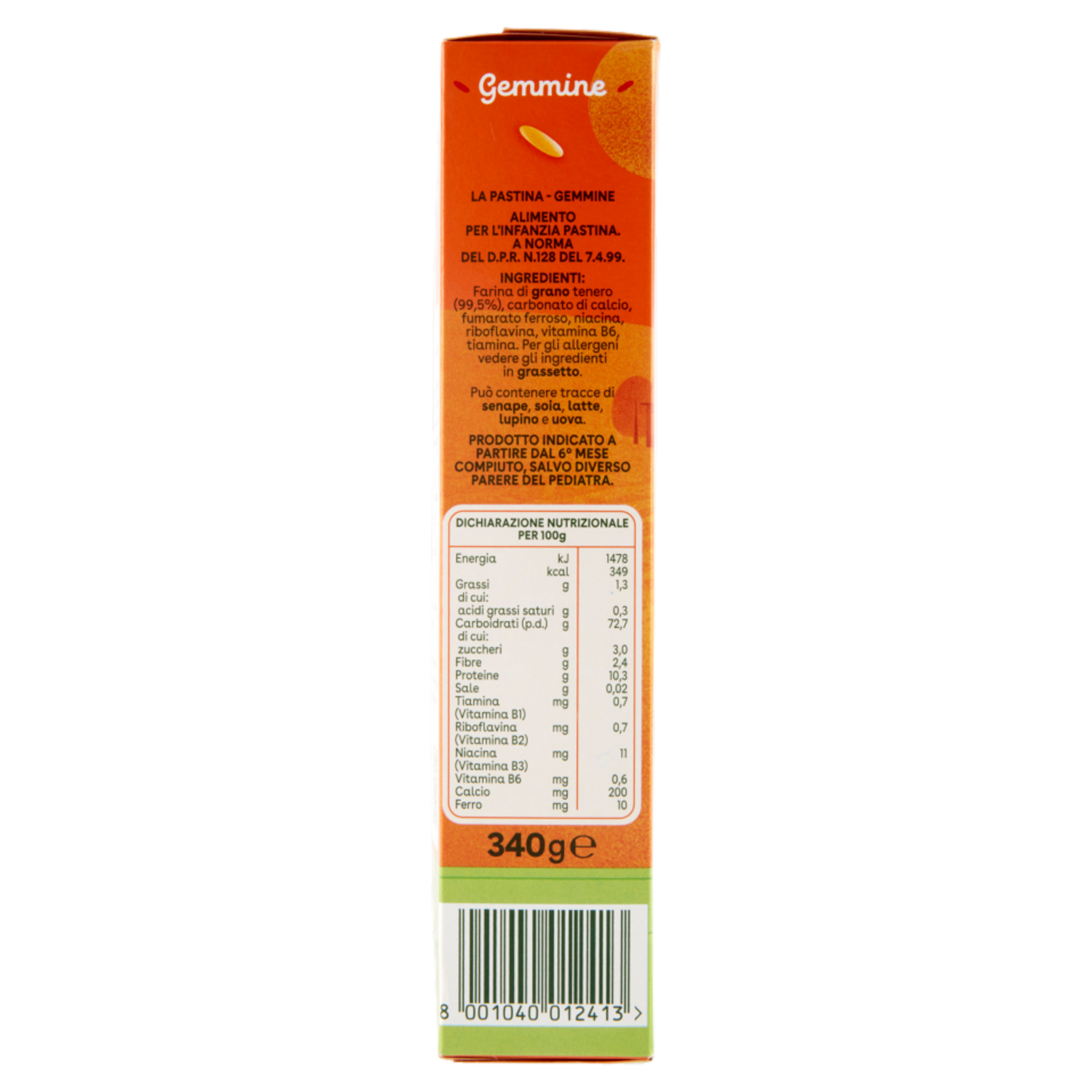 Preparazione e dosi Per preparare la pappa aggiungere 2 cucchiai di Gemmine Plasmon al brodo bollente (200/250 ml) e cuocere per 4 minuti. Per prepararla asciutta cuocere in 500 ml di acqua bollente per 4 minuti e scolarla bene. Prova il brodo di verdure Plasmon e scegli tra le varietà di omogeneizzati o liofilizzati Plasmon, completa poi con un cucchiaino di olio extravergine di oliva (1 cucchiaio corrisponde a circa 12 g). Le quantità sono indicative e possono variare a giudizio del Pediatra in funzione dell'età e dell'appetito del bambino. Prodotto indicato a partire dal 6° mese compiuto, salvo diverso parere del pediatra.