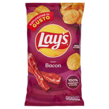 Esplosione di gusto Scopri il gusto irresistibile di Lay's Bacon, patate tagliate a fettine sottili, preparate con cura e condite deliziosamente. 100% Ingredienti di Qualità - Senza coloranti artificiali - Senza conservanti