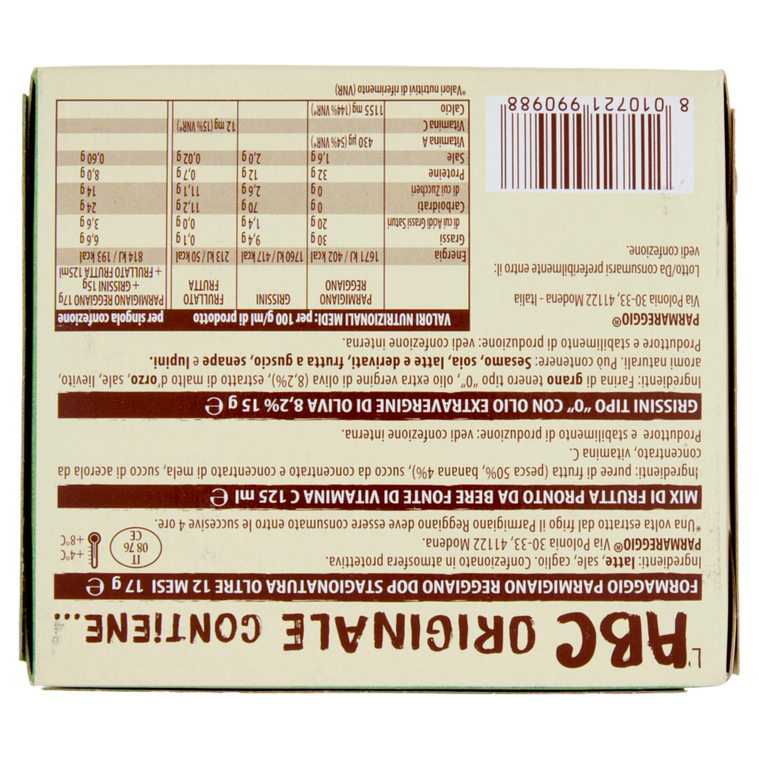 Grissini tipo "0" con olio extravergine di oliva 8,2% 15 g ℮ - Mix di frutta pronto da bere fonte di vitamina C 125 ml ℮ - Formaggio Parmigiano Reggiano DOP stagionatura oltre 12 mesi 17 g ℮ - L'ABC Originale contiene...