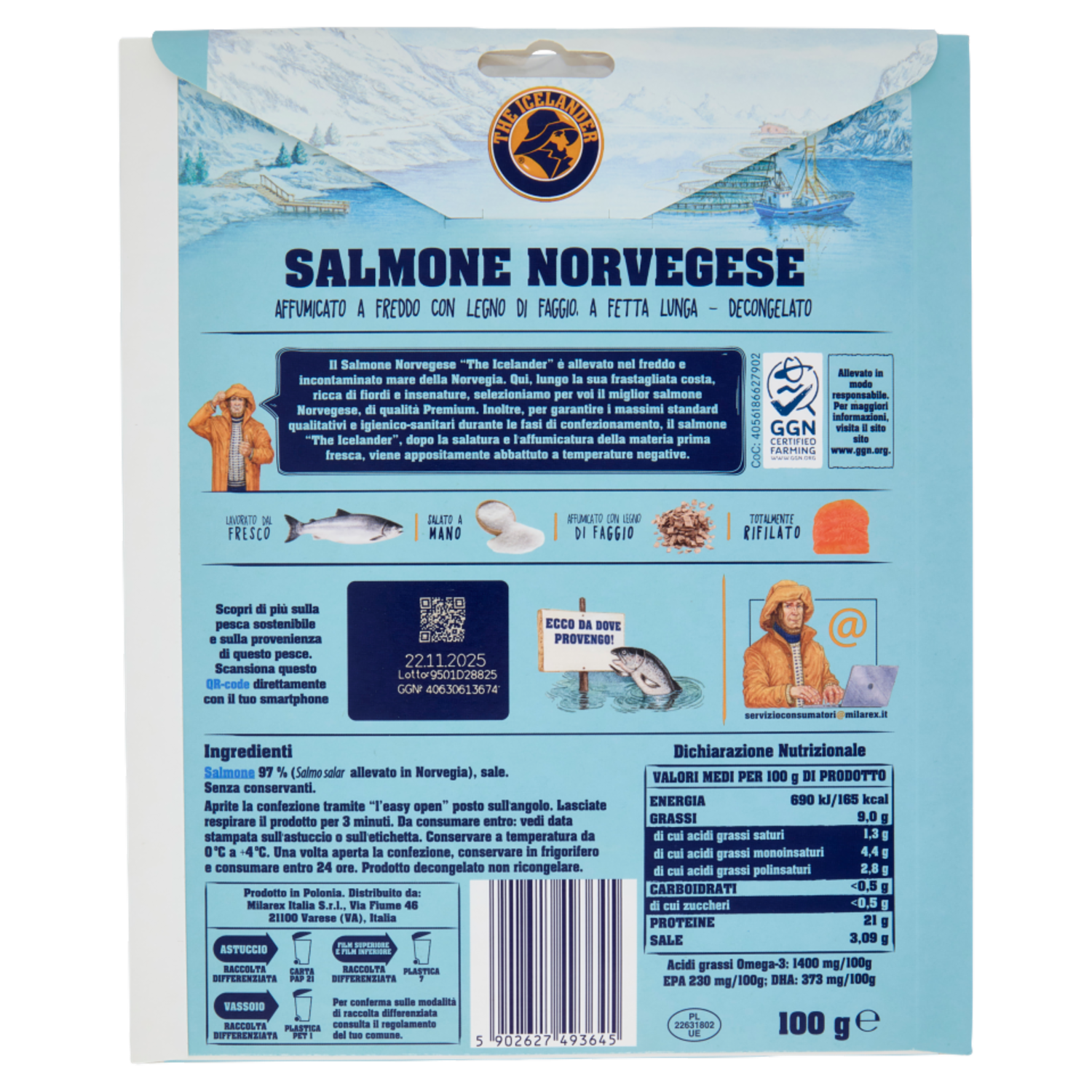 GGN - Certified aquaculture - www.ggn.org - Questo prodotto proviene da un'azienda che è stata certificata in maniera indipendente, è conforme alle buone pratiche in acquacoltura ed è autorizzata a esibire il logo GGN.ORG. Grazie al codice di 13 cifre è possibile visualizzare le informazioni relative all'azienda direttamente sul portale www.ggn.org - CoC 4056186627902