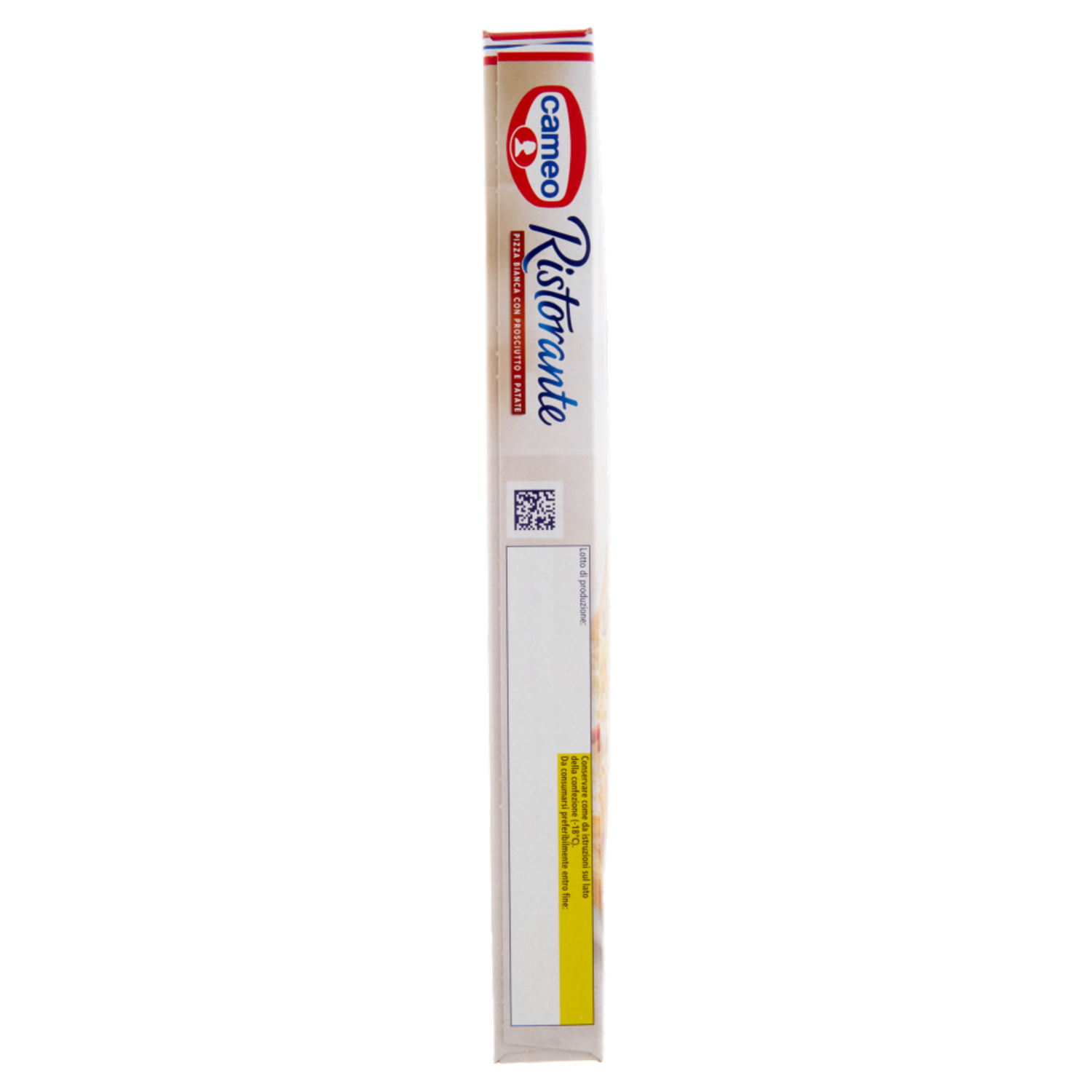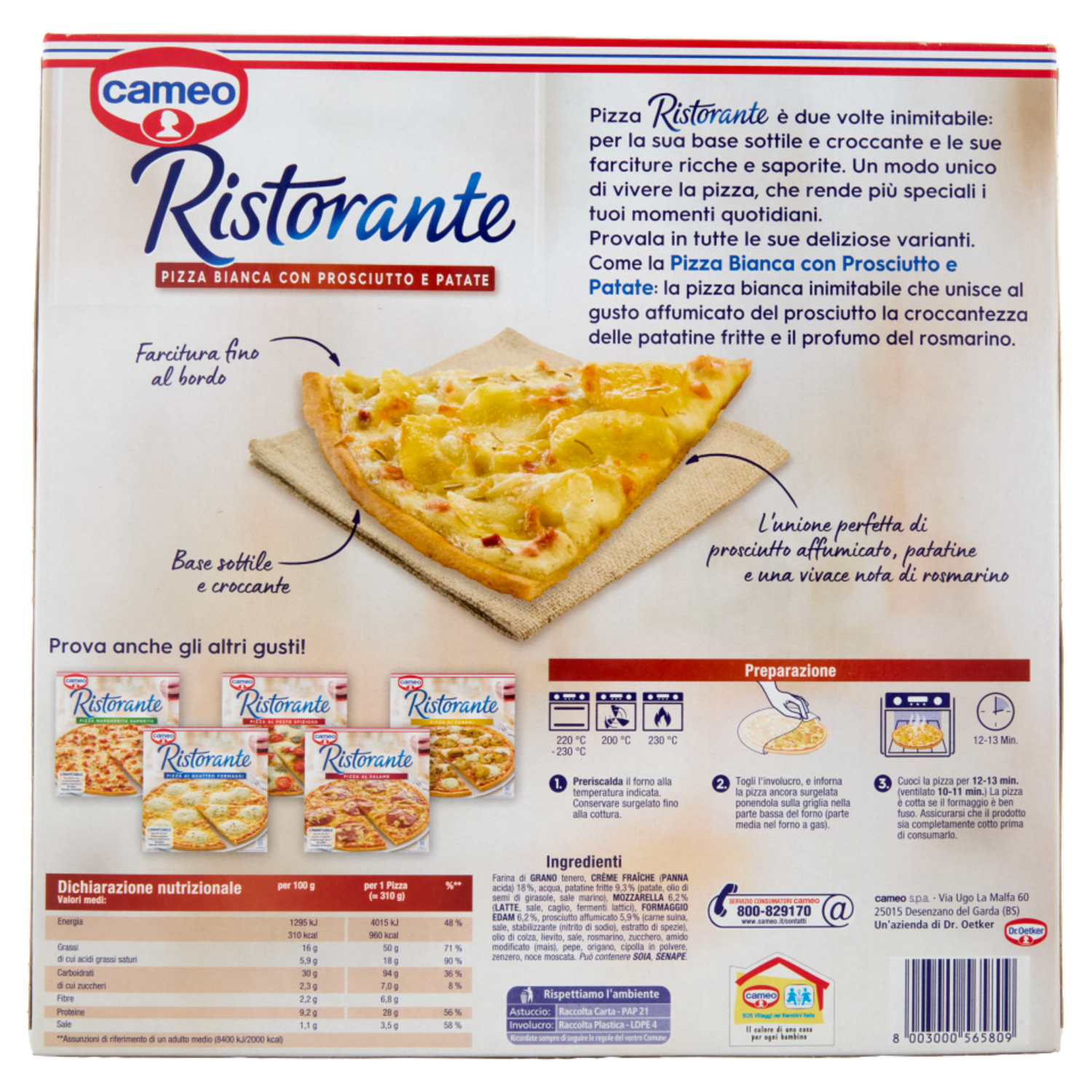 Pizza Ristorante è due volte inimitabile: per la sua base sottile e croccante e le sue farciture ricche e saporite. Un modo unico di vivere la pizza, che rende più speciali i tuoi momenti quotidiani. Provala in tutte le sue deliziose varianti. Come la Pizza Bianca con Prosciutto e Patate: la pizza bianca inimitabile che unisce al gusto affumicato del prosciutto la croccantezza delle patatine fritte e il profumo del rosmarino. - Farcitura fino al bordo - L'unione perfetta di prosciutto affumicato, patatine e una vivace nota di rosmarino - Base sottile e croccante