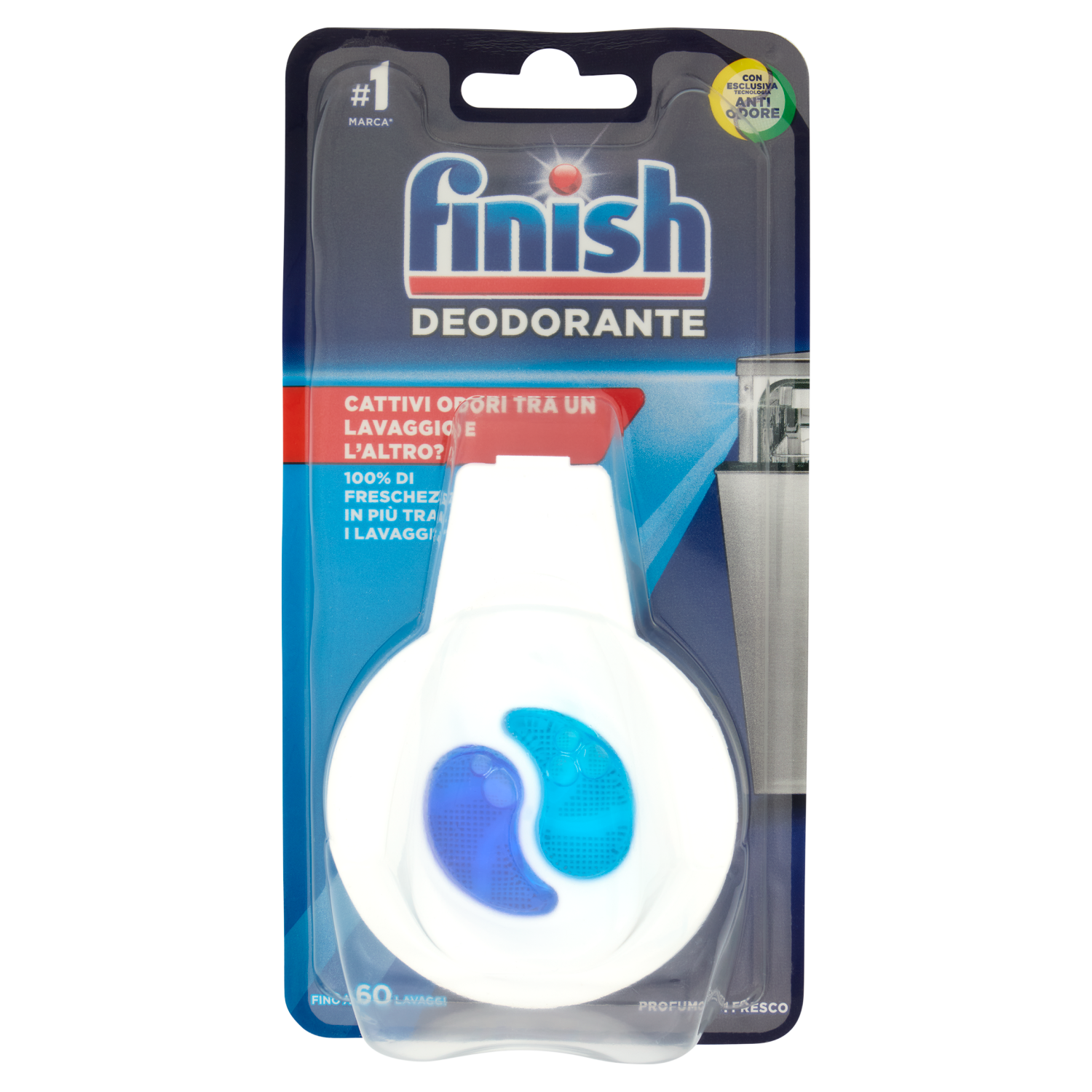 Finish Deodorante Tra un lavaggio e l'altro, i residui di sporco potrebbero essere la causa dei cattivi odori nella tua lavastoviglie. Grazie alla sua esclusiva tecnologia Anti Odore, Finish Deodorante Profumo di Fresco ti garantisce il 100% di freschezza in più tra i lavaggi**, così potrai godere di un profumo rinfrescante ogni volta che aprirai la tua lavastoviglie. **Fragranza 2 volte più fresca e percezione meno intensa del cattivo odore tra un lavaggio e l'altro rispetto al non utilizzo del prodotto