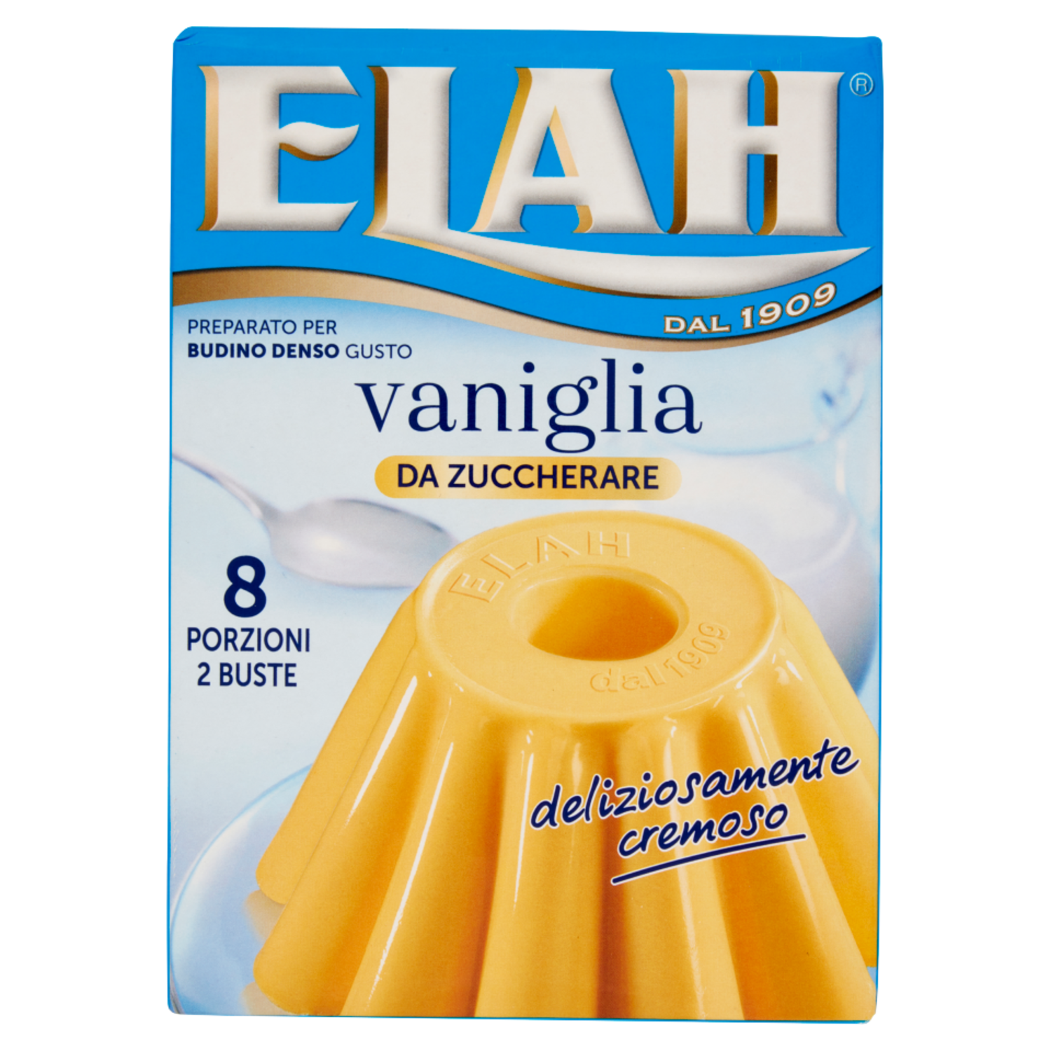 Aggiungere ½ litro di latte al contenuto di una busta e 40/45 g di zucchero. Lo zucchero può essere sostituito con un dolcificante ipocalorico idoneo alla cottura. Si può preparare anche con latte senza lattosio 1 Versare il contenuto di una busta in una casseruola ed aggiungere 40/45 g di zucchero (2 cucchiai da tavola). Aggiungere una parte del ½ litro di latte, mescolando fino ad ottenere una crema senza grumi. 2 Versare il restante latte e portare ad ebollizione. Far bollire per 1 minuto a fuoco moderato, continuando a mescolare. Il Budino da zuccherare Elah si addensa durante la cottura. 3 Versare in uno stampo unico o in 4 stampini monodose, precedentemente inumiditi. Il Budino Denso può essere servito tiepido in coppa oppure freddo dopo 2 ore di frigorifero. Provalo anche al cioccolato!