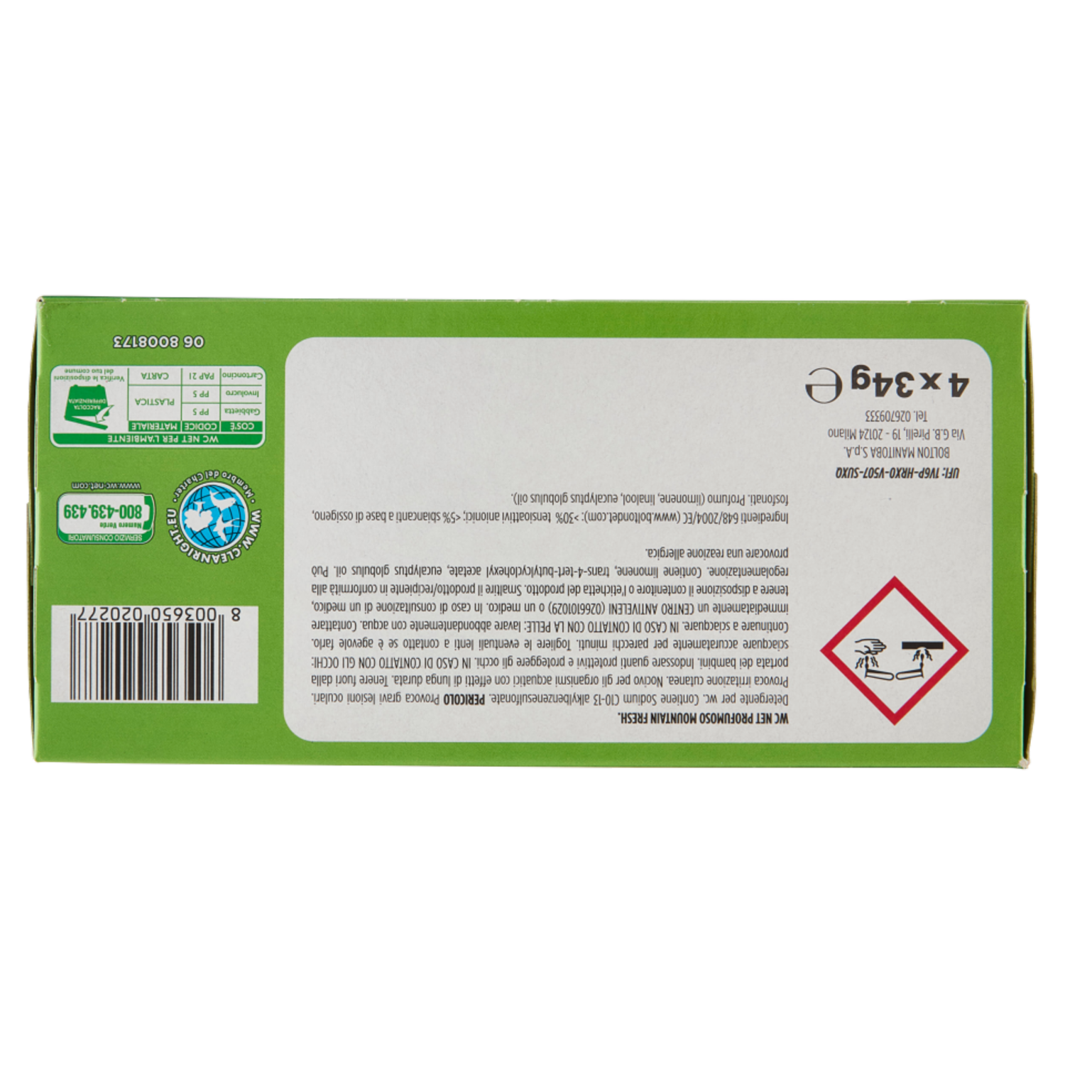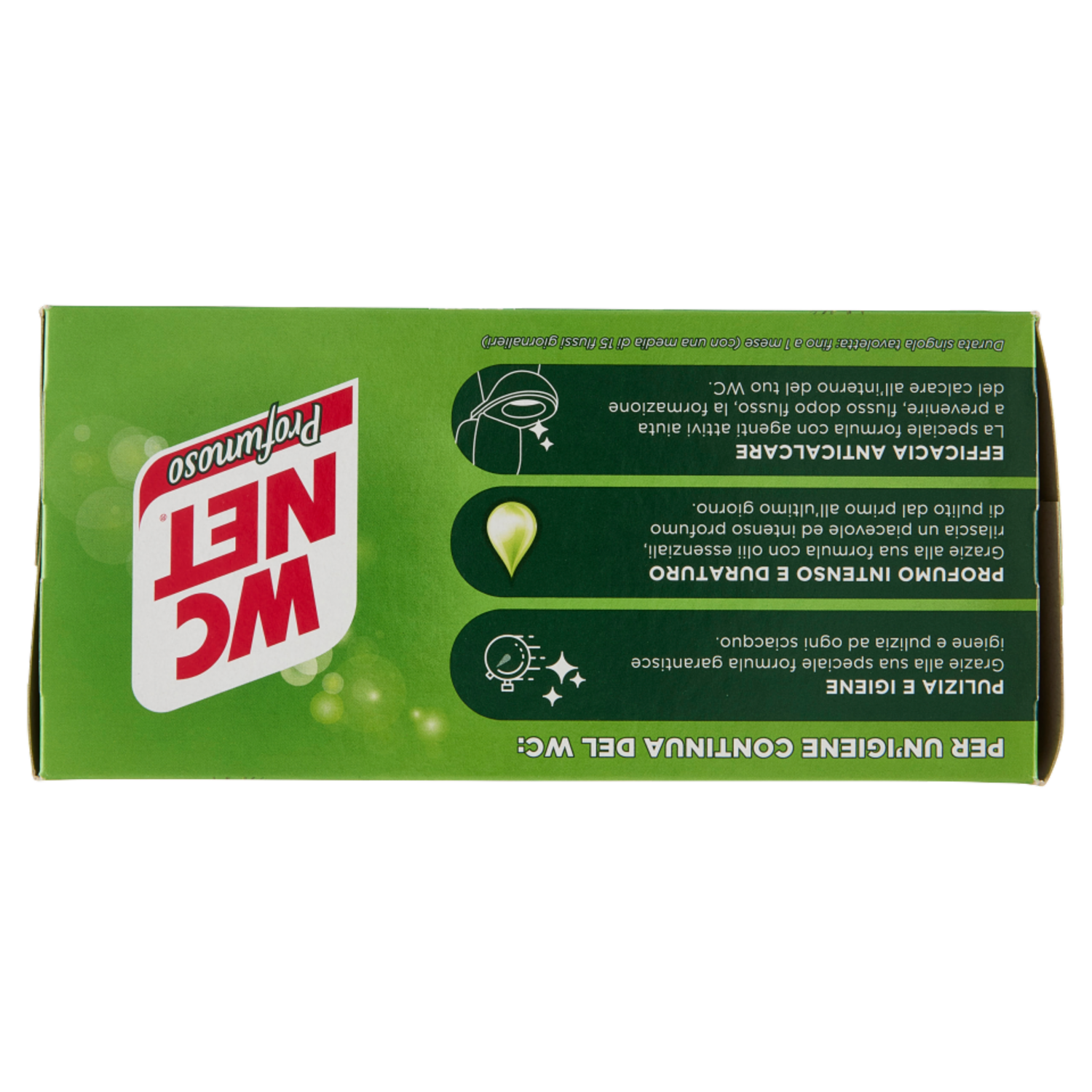 Per una igiene continua del WC flusso dopo flusso Pulisce e igienizza Grazie alla sua speciale formula garantisce igiene e pulizia ad ogni sciacquo. Efficacia anticalcare La speciale formula con agenti attivi aiuta a prevenire, flusso dopo flusso, la formazione del calcare all'interno del tuo WC. Profumo intenso e duraturo Grazie agli oli essenziali contenuti nella sua formula, rilascia un piacevole ed intenso profumo di pulito dal primo all'ultimo giorno. Durata della tavoletta: 1 mese (con una media di circa 15 flussi giornalieri)