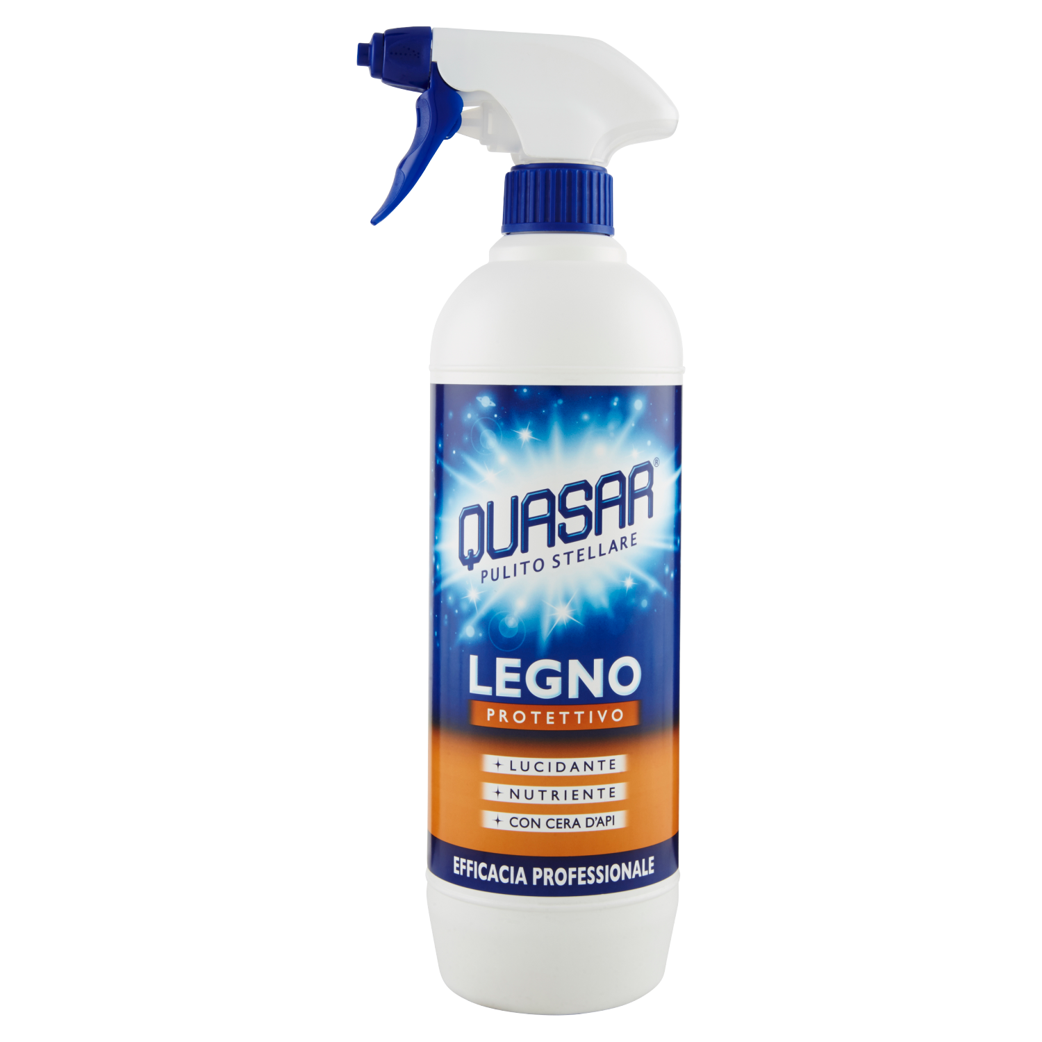 Quasar Legno pulisce efficacemente le superfici in legno (mobili, porte, parquet...) facendole brillare senza lasciare tracce e aloni. Arricchito con cera d'api, assicura un effetto protettivo e antipolvere. Non serve risciacquare e ne basta poco. Per un pulito veloce e profondo.