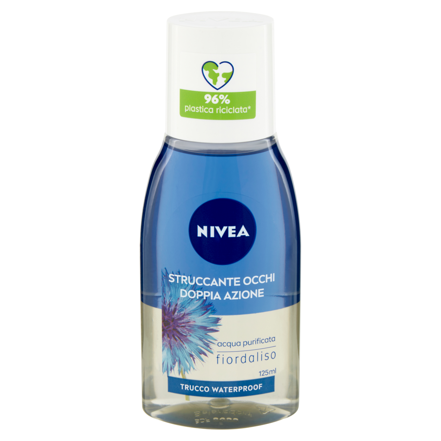 Il nostro Nivea Struccante Occhi Doppia Azione rimuove efficacemente anche il make-up waterproof, proteggendo le ciglia dall'indebolimento. - Formula vegana - *96% di materiale riciclato esclusi etichetta, tappo e inserto. www.nivea.it/sostenibilità Compatibilità cutanea dermatologicamente ed oftalmologicamente comprovata