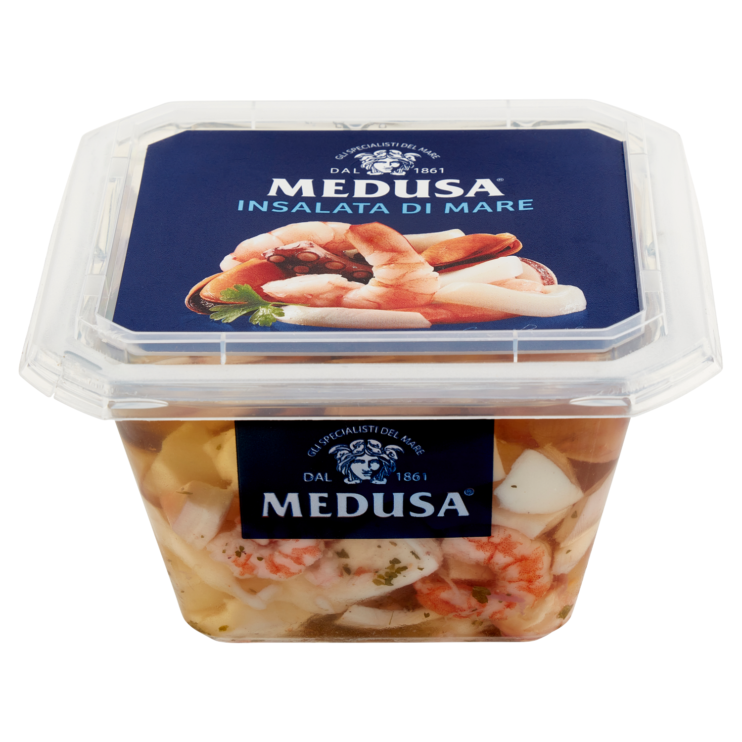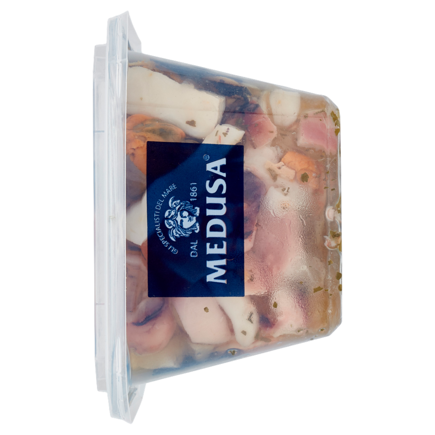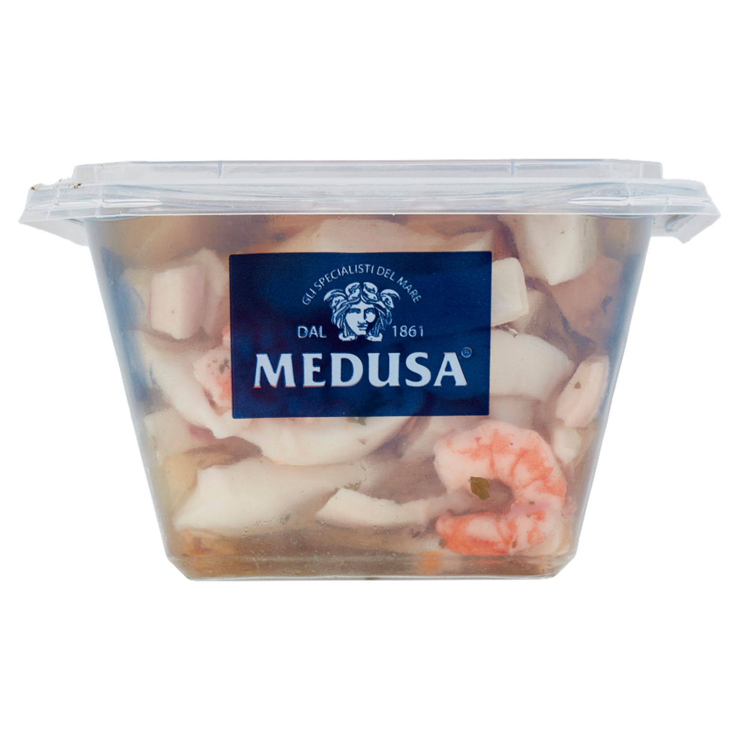 Preparazione alimentare a base di molluschi e crostacei 53% (totani, mazzancolle, polpo, cozze, seppie, aceto di vino, sale, succo di limone, aromi naturali, correttori di acidità: acido citrico, citrati di sodio, antiossidante: acido l-asorbico. Conservante: E202)