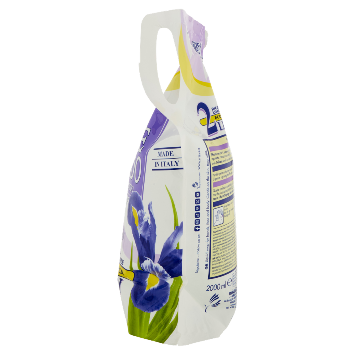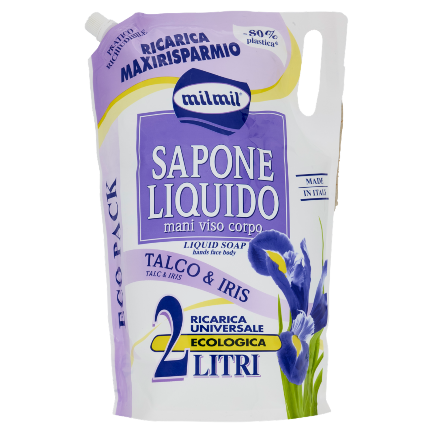 -80% plastica* contribuisci a ridurre il volume della plastica sull'ambiente * rispetto ad un packaging tradizionale Informazioni al consumatore Prodotto Efficace perchè il sapone liquido MilMil è specifico per detergere mani, viso e corpo in alternativa alla saponetta. Pensato e studiato per l'igiene e la pulizia quotidiana, lascia la pelle soffice, idratata e piacevolmente morbida. Delicato perchè i suoi selezionati componenti sono delicati, è quindi ideale all'uso per tutta la famiglia. Universale Perché questa confezione contiene 2 litri di Sapone Liquido, idoneo alla ricarica di tutti i flaconi con dispenser e gli erogatori flip-top e push-pull. Si può quindi definire per utilizzo Universale. Ecologico Questa confezione vale 4 flaconi da 500 ml, 2 flaconi da 1 litro, 8 flaconi da 250 ml delle più comuni marche. Acquistando MilMil Ricarica 2 Litri risparmi subito il costo dei rispettivi flaconi e contribuisci così a ridurre l'impiego della plastica non biodegradabile e il volume dei rifiuti.