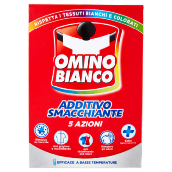 Rispetta i tessuti Adatto per bianchi e colorati La nuova formula di Omino Bianco Additivo Smacchiante combina la super efficacia contro lo sporco al rispetto di tessuti e colori, per un risultato perfetto! - Rimuove tutti i tipi di macchie - Ha un'azione anti grigiore e ingiallimento - Anti sbiadimento dei colori - Rimuove gli odori - Ha un'azione extra igienizzante* Inoltre ti garantisce un'azione efficace già a basse temperature. *Rispetto all'uso del solo detersivo Omino Bianco. Il lavaggio a basse temperature garantisce: - Maggiore risparmio energetico - Meno emissioni di CO₂ in atmosfera - Migliore cura dei tessuti La confezione con carta riciclata garantisce: - Minore deforestazione - Meno rifiuti nell'ambiente - Riduzione dello spreco d'acqua Confezione con carta riciclata