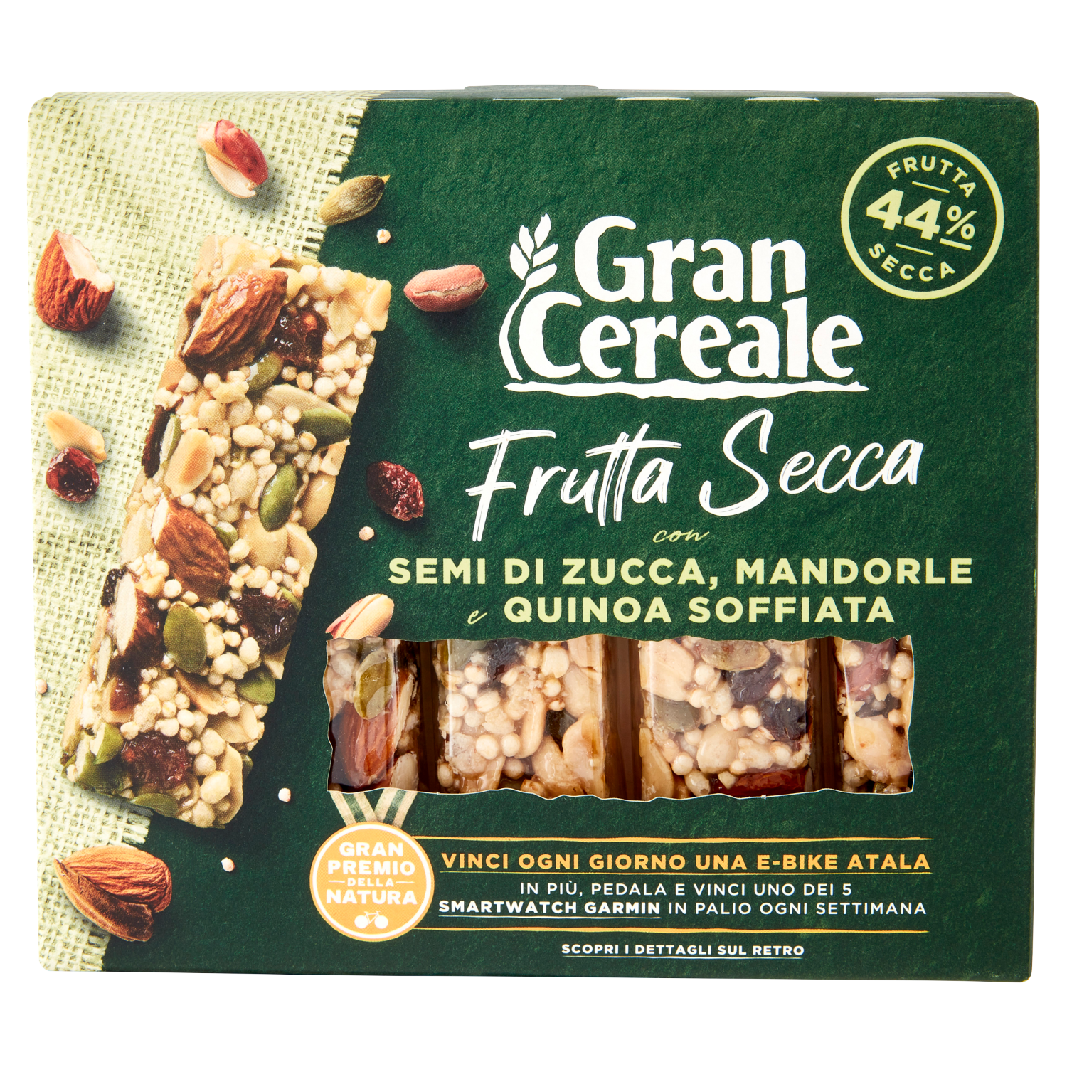 Gran premio della natura Vinci ogni giorno una e-bike Atala In più, pedala e vinci uno dei 5 smartwatch Garmin in palio ogni settimana 1 Vinci Ogni Giorno una E-Bike Atala E-Space 7.1 Inserisci il codice che trovi nella confezione sul sito o sull'app Grancereale e scopri subito se hai vinto. 2 In più, se vai sull'app Grancereale e percorri 10 km in bici, vinci uno dei 5 Smartwatch Germin Vívoactive 4 in palio Ogni Settimana. Scopri di più su grancereale.it o sull'app Grancereale Concorso valido in Italia dal 19/07/2022 al 12/12/2022. Termine richiesta premi: 27/12/2022. Montepremi € 212.371,95 IVA compresa. Orari di partecipazione nel regolamento completo su www.grancereale.it