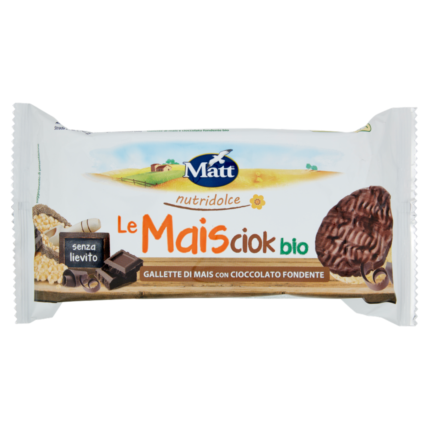 Le Maisciok sono golose gallette ricoperte di finissimo cioccolato fondente. Prodotte con il meglio del mais, regalano un gusto intenso e irresistibile. 100% vegetali, fonte di fibre, senza lievito e senza glutine, possono essere un valido aiuto per chi vuole alimentarsi in modo sano e mantenersi in forma. Ideali a colazione e a merenda, sono un'alternativa semplice e completa al solito snack e possono essere consumate in qualsiasi momento della giornata. ... non solo bio - fonte di Fibre - senza Lievito - senza Glutine Adatto anche all'alimentazione vegana