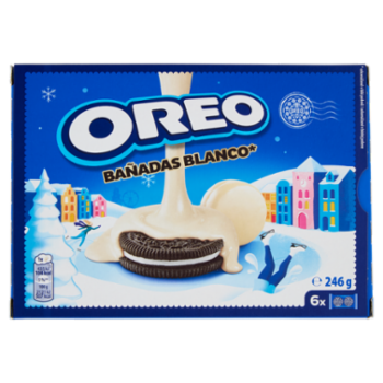 Biscotti (38%) al cacao magro ripieni di crema (19%) al gusto vaniglia, con copertura (43%) al gusto di cioccolato bianco