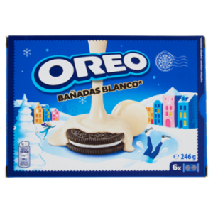 Biscotti (38%) al cacao magro ripieni di crema (19%) al gusto vaniglia, con copertura (43%) al gusto di cioccolato bianco
