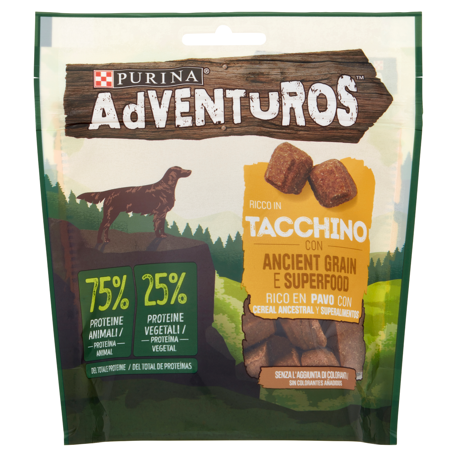 ADVENTUROS ricco in Tacchino con Ancient Grain e Superfood. Non c'è niente di più soddisfacente di scegliere per il tuo cane uno snack allo stesso tempo buono e nutriente, che ti faccia sentire bene nell'offrirglielo, perchè sai esattamente cosa c'è dentro! Per questo, Purina Adventuros ha creato uno snack squisito, ricco in Tacchino, che combina il gusto selvatico con la bontà del miglio (cereale naturale antico) e l'aggiunta di superfood (piselli e mirtilli rossi). Questi snack sono preparati con ingredienti di qualità e senza l'aggiunta di coloranti, conservanti e aromatizzanti artificiali. La particolare consistenza ruvida rende unica l'esperienza di gusto del tuo cane, scatenando il suo spirito d'avventura. - 75% Proteine animali - 25% Proteine vegetali del totale proteine - Senza l'aggiunta di coloranti