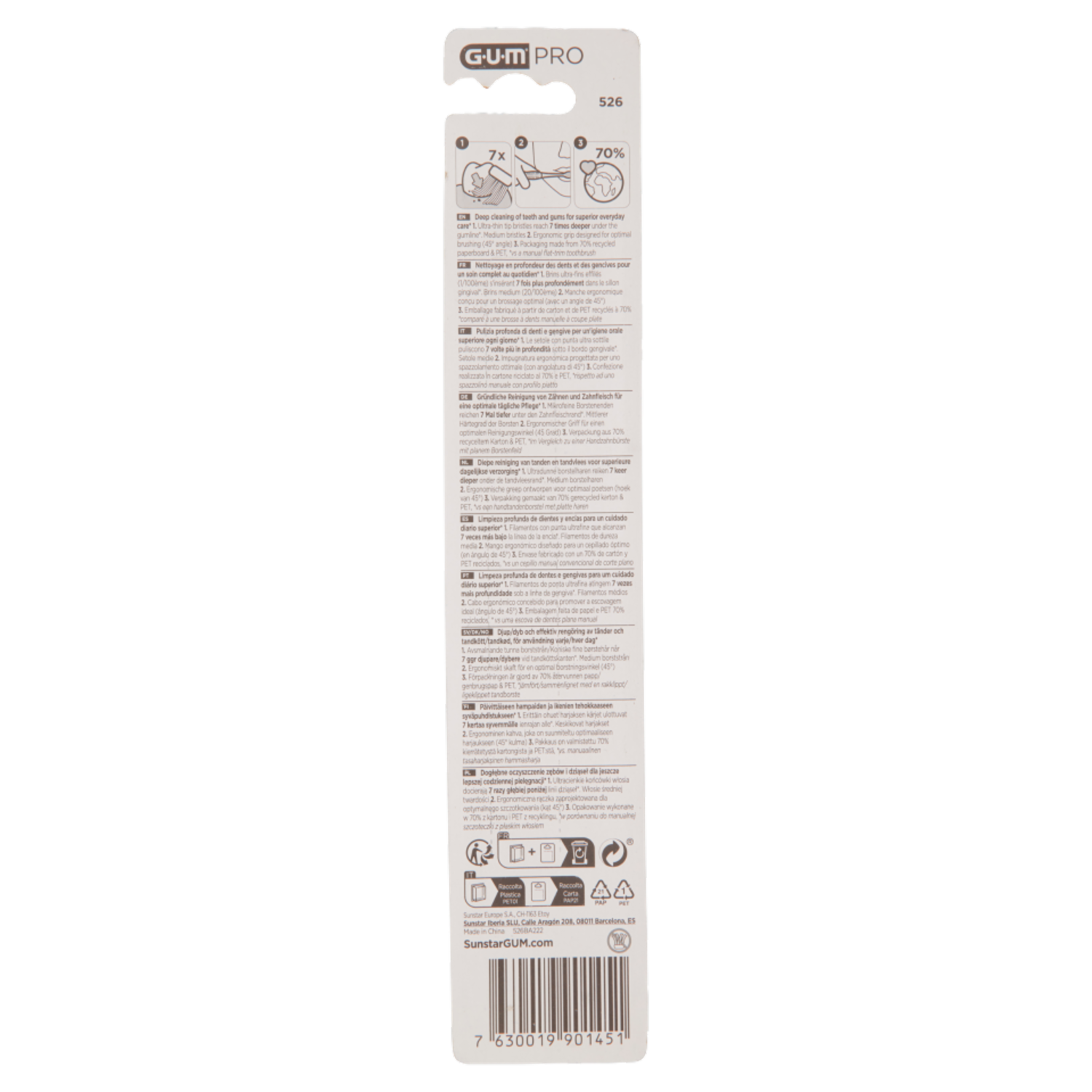 Pulizia profonda di denti e gengive per un'igiene orale superiore ogni giorno* 1. Le setole con punta ultra sottile puliscono 7 volte più in profondità sotto il bordo gengivale*. Setole medie 2. Impugnatura ergonomica progettata per uno spazzolamento ottimale (con angolatura di 45°) 3. Confezione realizzata in cartone riciclato al 70% e PET *rispetto ad uno spazzolino manuale con profilo piatto