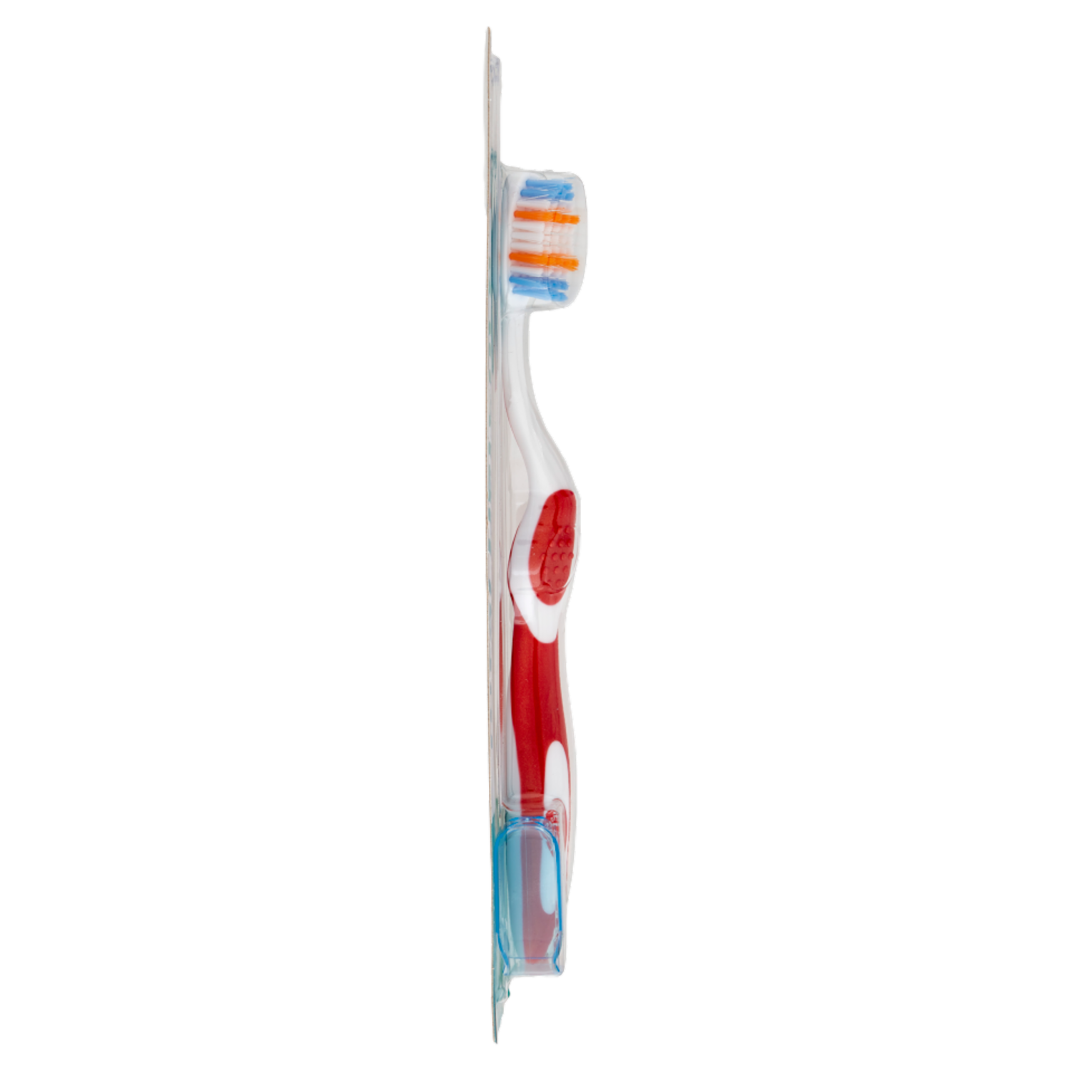 Azione profonda, strumento ideale per una efficace igiene orale quotidiana, aiuta a rimuovere la placca batterica causa principale della carie e dei disturbi gengivali. Setole con taglio multilivello e punte arrotondate penetrano facilmente tra gli spazi interdentali. Il pulisci lingua sul dorso della testina rimuove batteri dalla lingua che possono essere causa disturbi gengivali, carie ed alito cattivo. Collo a tripla angolazione permette una maggiore precisione nello spazzolamento ed una maggiore facilità nel raggiungere le zone più difficili della bocca. Impugnatura ergonomica in gomma antiscivolo agevola il corretto utilizzo dello spazzolino. Prodotto sterilizzato durante la fase di confezionamento.