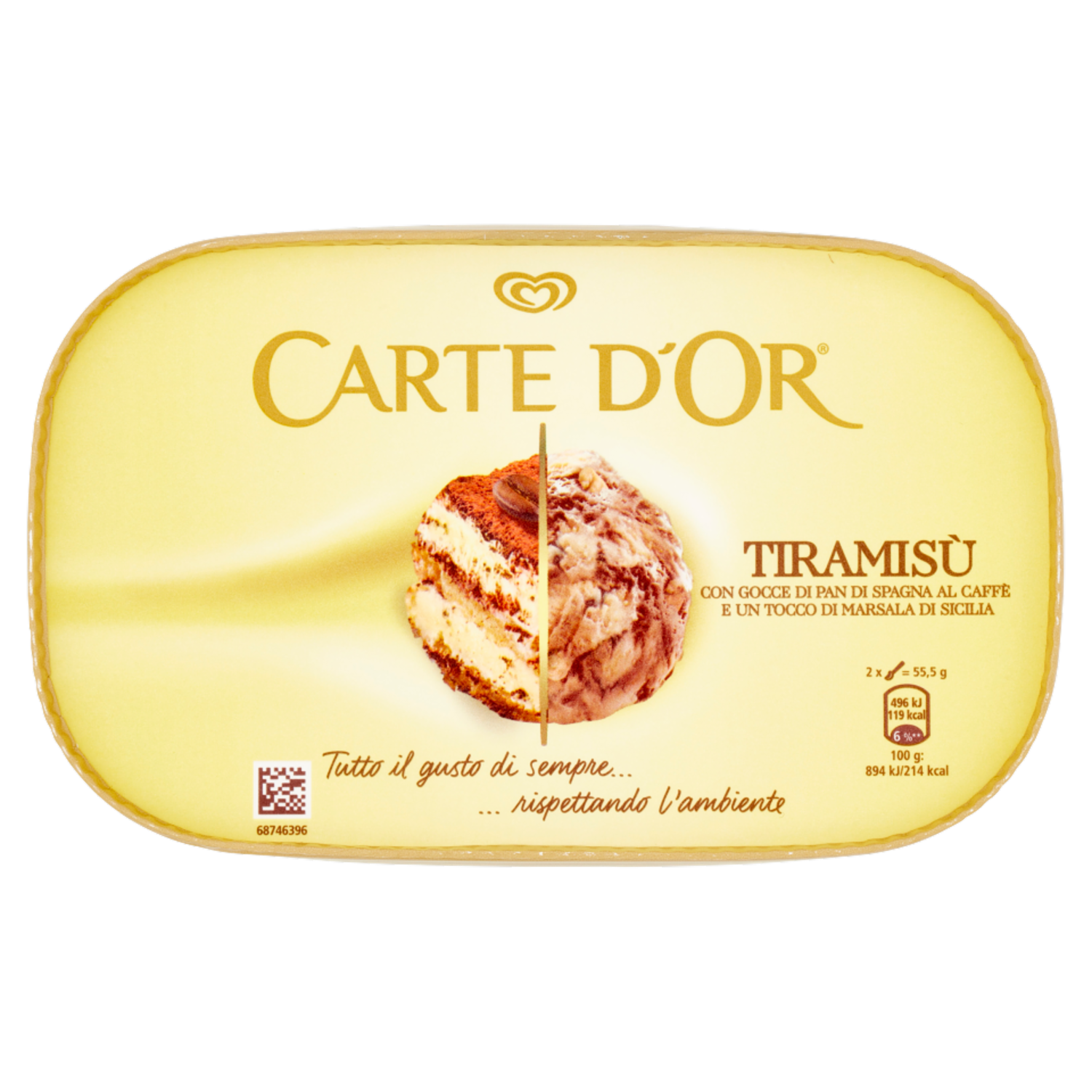 Gelato al gusto di tiramisù con gocce di pan di spagna al caffè (7%) e variegatura al cioccolato al latte (5%), ricoperto di cacao magro (0,5%)
