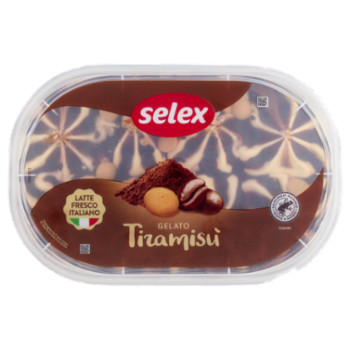 Gelato al gusto di tiramisù 80,5% (latte fresco scremato pastorizzato italiano 45% di cui 32% nel prodotto finito, zucchero, sciroppo di glucosio, acqua, olio di cocco, tuorlo d'uovo 5% di cui 4% nel prodotto finito, vino Marsala 4% di cui 3% nel prodotto finito, latte scremato in polvere, siero di latte in polvere, emulsionanti: mono- e digliceridi degli acidi grassi, addensanti: alginato di sodio, farina di semi di carrube, concentrato vegetale di carota e zucca, aroma, aroma naturale di caffè)
