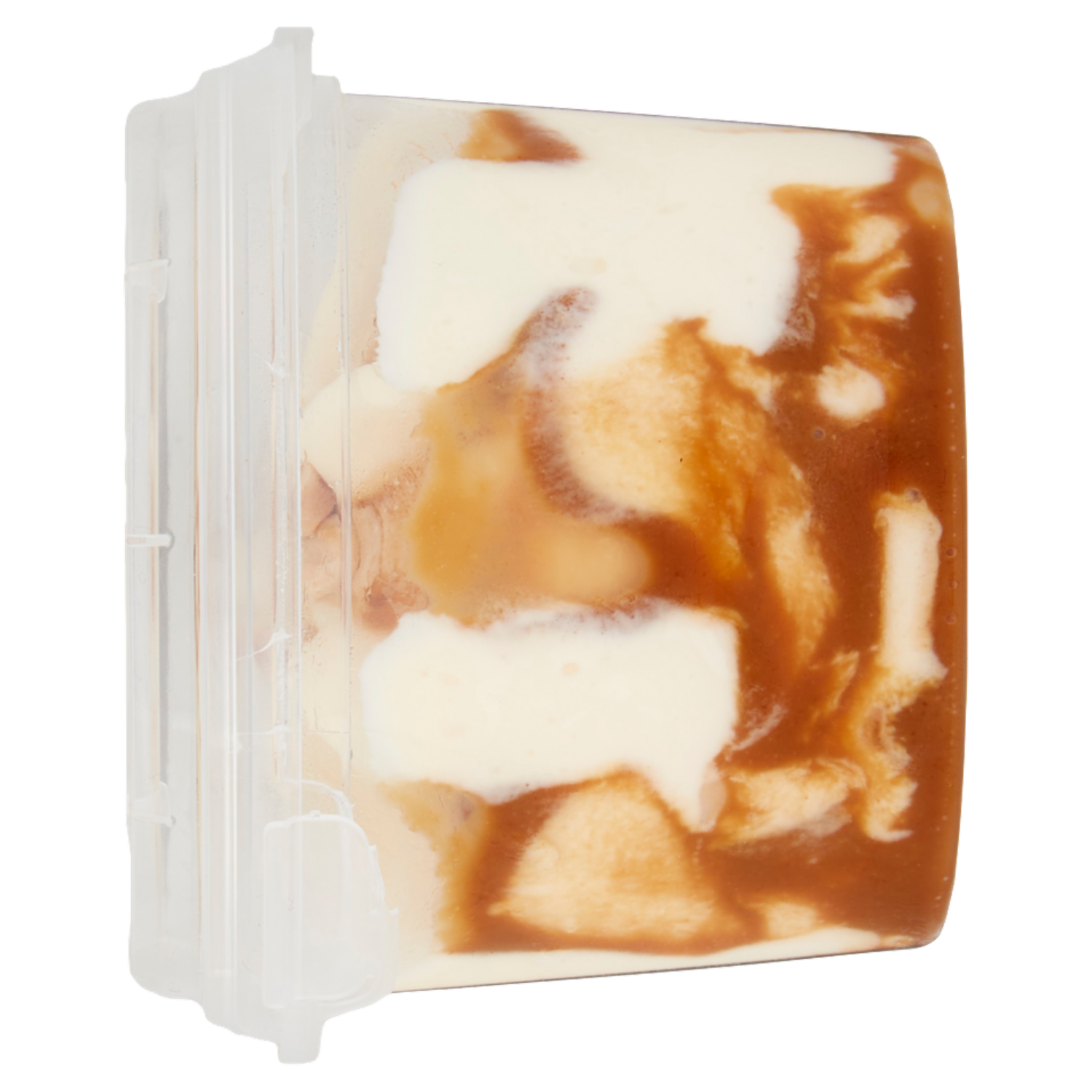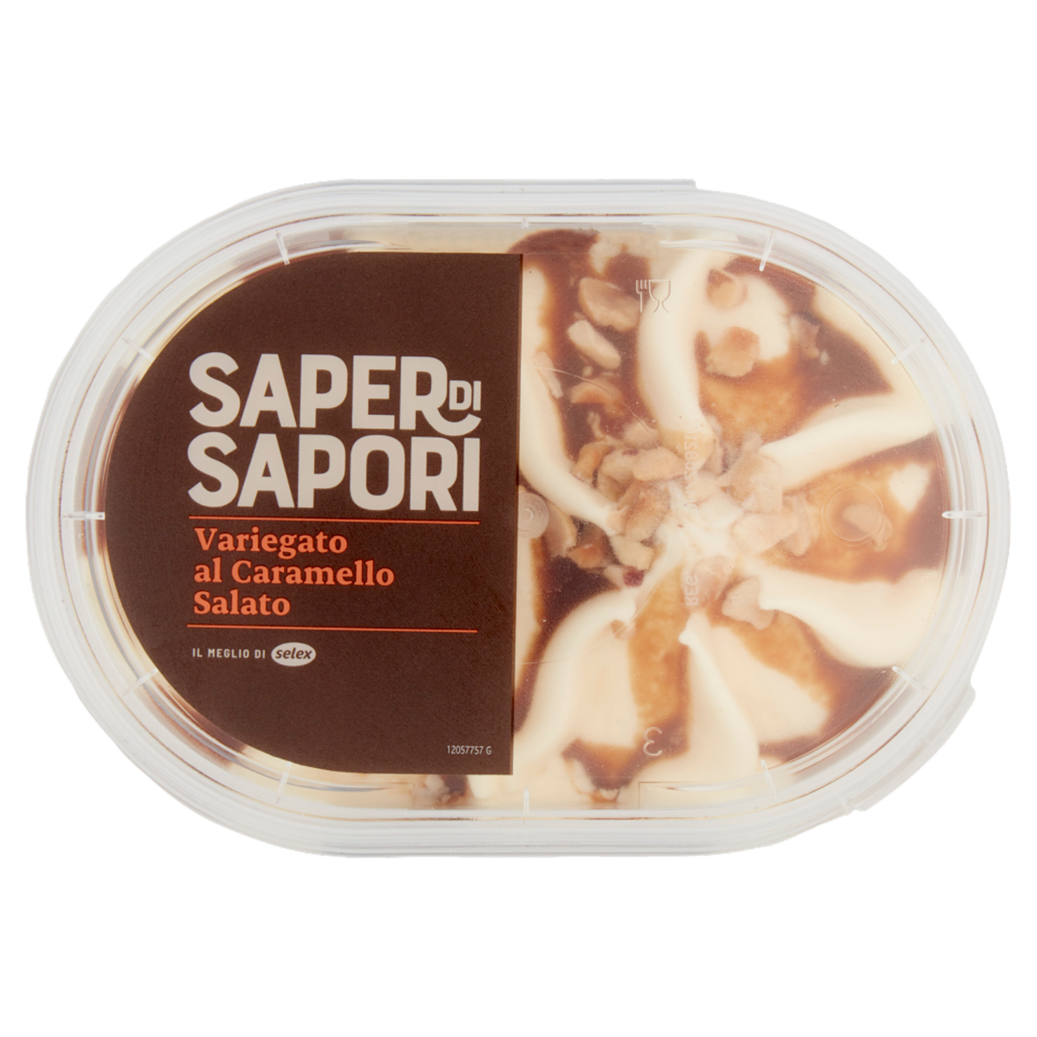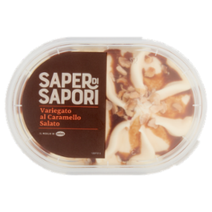 Gelato al gusto di crema variegato al gusto di caramello salato (15%) e decorato con granella di nocciola Prodotto ottenuto esclusivamente da "Nocciola del Piemonte IGP"